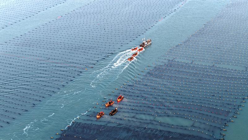 1月27日,在山东省荣成市爱伦湾海洋牧场,养殖工人在运输小海带(无人机照片)。
