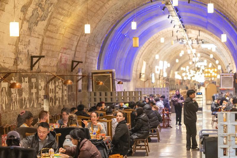 在重庆市两江新区,外籍人员在防空洞内品尝重庆火锅(1月24日摄)。