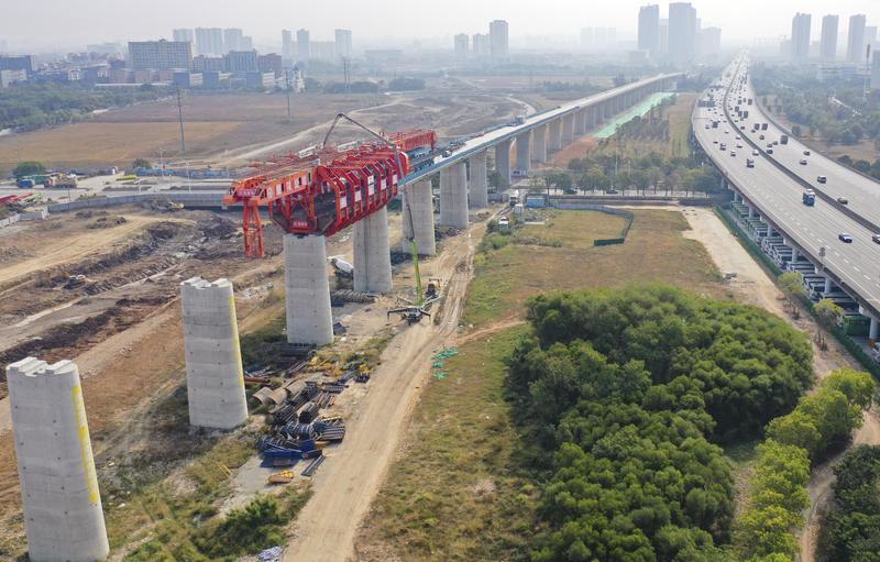 1月28日,中铁十一局承建的深江铁路跨沿江高速特大桥移动模架现浇简支梁施工任务过半,建设有序推进。