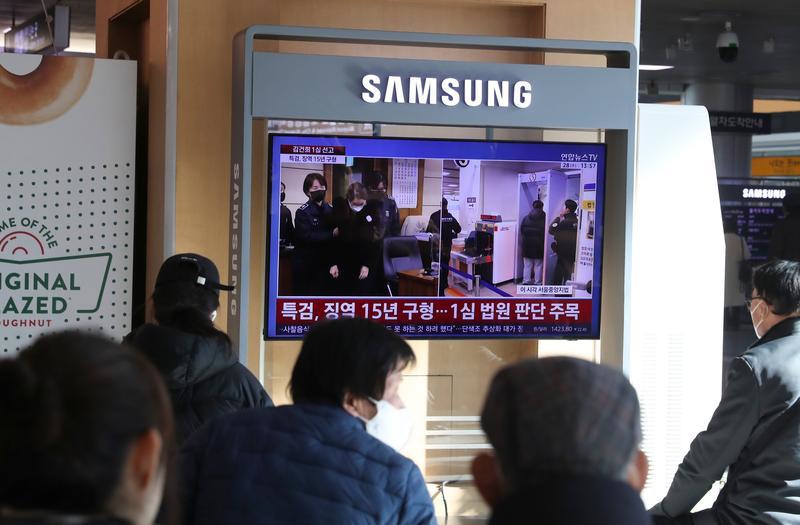 1月28日,韩国民众在首尔火车站观看金建希的新闻。