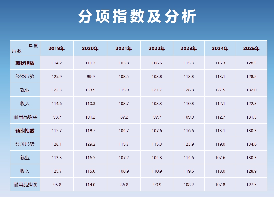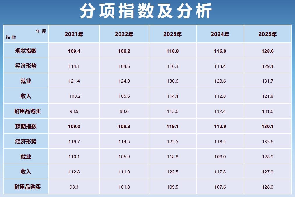 报告显示,2025年四川消费者信心总指数为129.4,其中,现状评价指数为128.5,预期信心指数为130.3。2025年四川消费者信心总指数同比(与“2024年”相比,下同)上升14.7个百分点。其中,现状评价指数同比上升12.2个百分点;预期指数同比上升17.2个百分点。2025年,四川消费者信心总指数较去年大幅上升,且明显超过2019年疫情前水平。无论是信心总指数,还是现状指数与预期指数,均创2019年以来新高,显示四川经济持续恢复向好,消费者信心稳步上升。