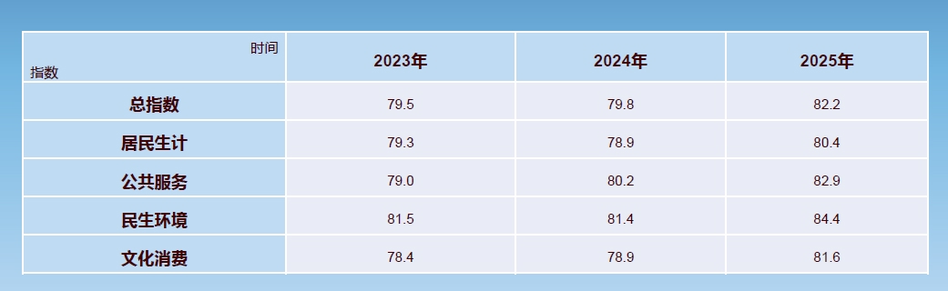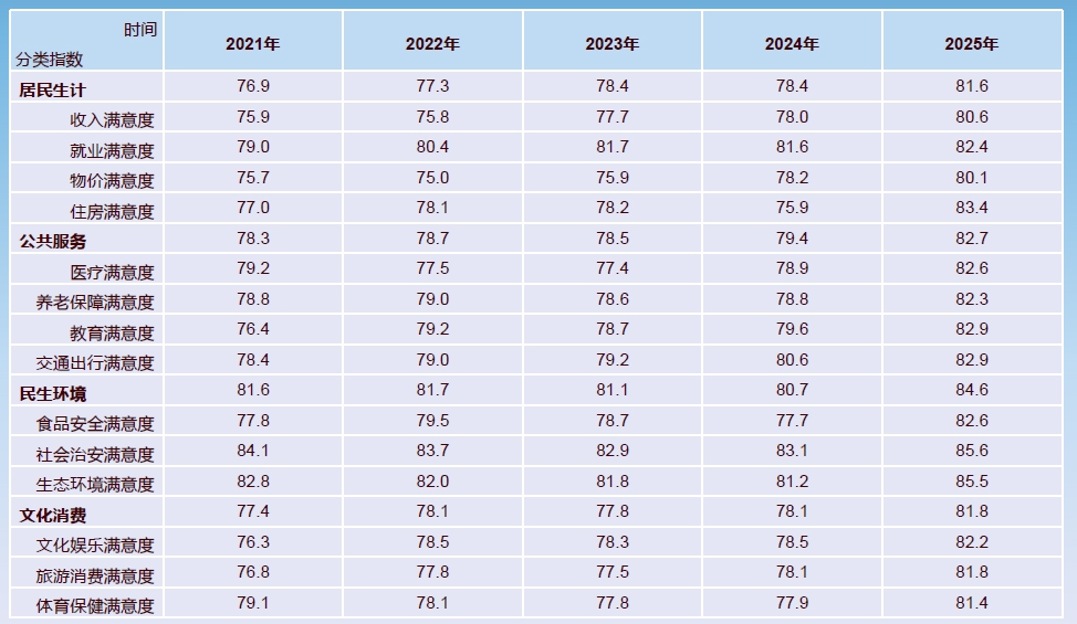 2025年四川民生满意度总指数82.6,较2024年同比上升3.5个百分点,实现自疫情以来的最大增幅,反映出全省民生建设成效明显,民众获得感、幸福感、安全感进一步增强。民生满意度各分项指数都在80以上,同比均实现不同幅度增长。其中,社会治安、生态环境和住房满意度分别为85.6、85.5、83.4,居14个分项指数前三;物价、收入、体育保健满意度分别为80.1、80.6、81.4,位于14个分项指数后三名。