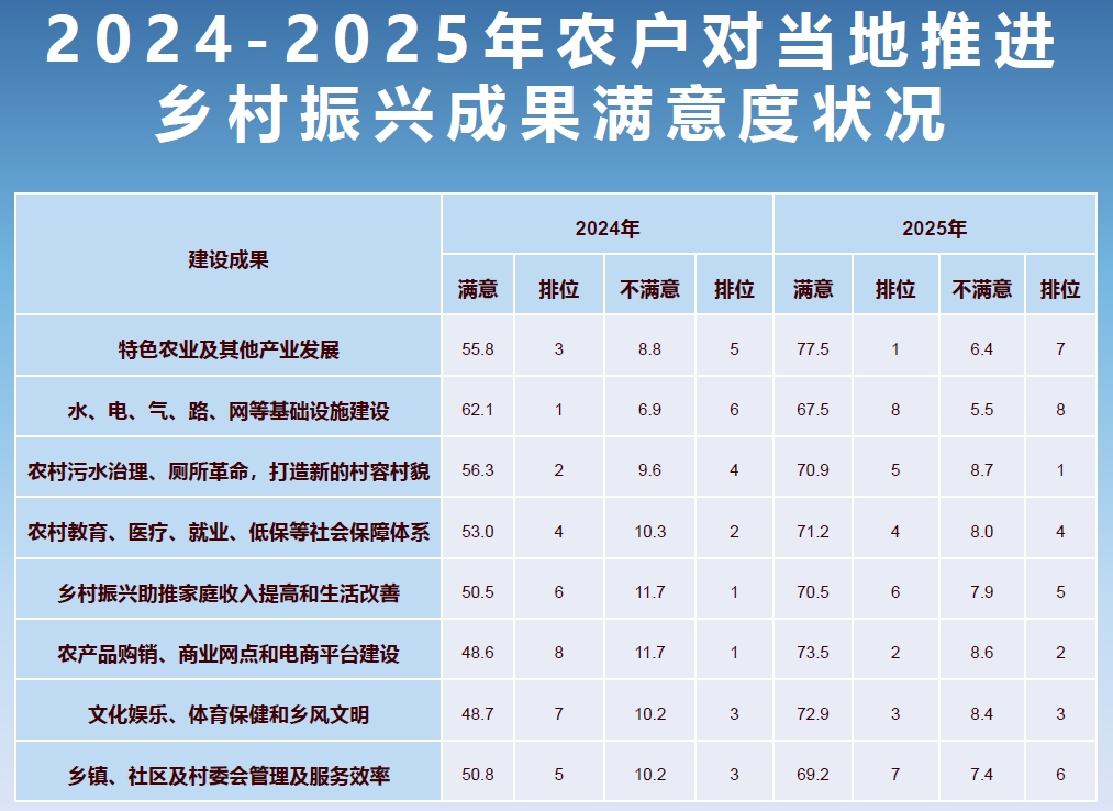 此外,课题组还针对2024年成渝地区双城经济圈乡村振兴情况进行了调查分析。报告显示,成渝地区双城经济圈乡村振兴建设各项满意度均明显提升。2025年调查显示,在乡村振兴建设成果的8个分项指标中,被访农民对于“特色农业及其他产业发展”“农产品购销、商业网点和电商平台建设”感到满意(含“很满意”和“比较满意”,下同)的占比分别达77.5%和73.5%,同比分别提升21.7和24.9个百分点。