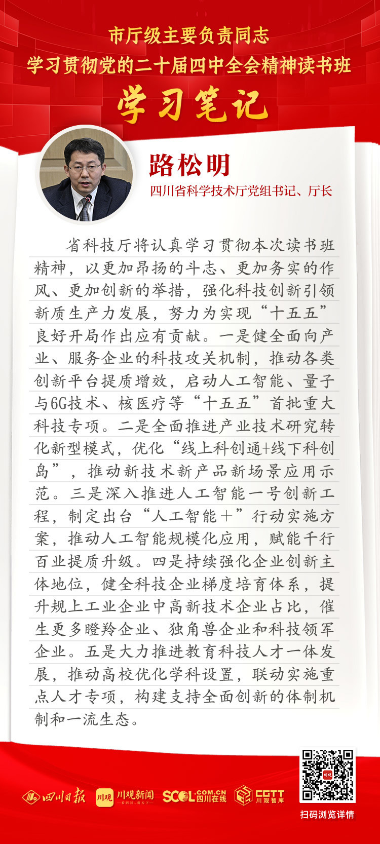 省科技厅将认真学习贯彻本次读书班精神,以更加昂扬的斗志、更加务实的作风、更加创新的举措,强化科技创新引领新质生产力发展,努力为实现“十五五”良好开局作出应有贡献。一是健全面向产业、服务企业的科技攻关机制,推动各类创新平台提质增效,启动人工智能、量子与6G技术、核医疗等“十五五”首批重大科技专项。二是全面推进产业技术研究转化新型模式,优化“线上科创通+线下科创岛”,推动新技术新产品新场景应用示范。三是深入推进人工智能一号创新工程,制定出台“人工智能+”行动实施方案,推动人工智能规模化应用,赋能千行百业提质升级。四是持续强化企业创新主体地位,健全科技企业梯度培育体系,提升规上工业企业中高新技术企业占比,催生更多瞪羚企业、独角兽企业和科技领军企业。五是大力推进教育科技人才一体发展,推动高校优化学科设置,联动实施重点人才专项,构建支持全面创新的体制机制和一流生态。