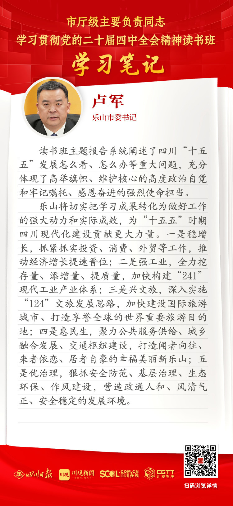 乐山将切实把学习成果转化为做好工作的强大动力和实际成效,为“十五五”时期四川现代化建设贡献更大力量。一是稳增长,抓紧抓实投资、消费、外贸等工作,推动经济增长提速晋位;二是强工业,全力挖存量、添增量、提质量,加快构建“241”现代工业产业体系;三是兴文旅,深入实施“124”文旅发展思路,加快建设国际旅游城市、打造享誉全球的世界重要旅游目的地;四是惠民生,聚力公共服务供给、城乡融合发展、交通枢纽建设,打造闻者向往、来者依恋、居者自豪的幸福美丽新乐山;五是优治理,狠抓安全防范、基层治理、生态环保、作风建设,营造政通人和、风清气正、安全稳定的发展环境。