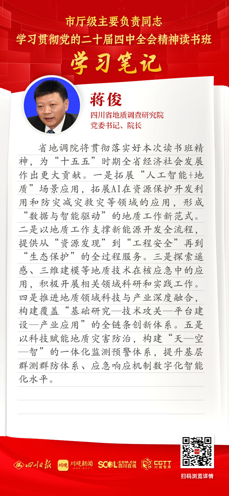 省地调院将贯彻落实好本次读书班精神,为“十五五”时期全省经济社会发展作出更大贡献。一是拓展“人工智能+地质”场景应用,拓展AI在资源保护开发利用和防灾减灾救灾等领域的应用,形成“数据与智能驱动”的地质工作新范式。二是以地质工作支撑新能源开发全流程,提供从“资源发现”到“工程安全”再到“生态保护”的全过程服务。三是探索遥感、三维建模等地质技术在核应急中的应用,积极开展相关领域科研和实践工作。四是推进地质领域科技与产业深度融合,构建覆盖“基础研究—技术攻关—平台建设—产业应用”的全链条创新体系。五是以科技赋能地质灾害防治,构建“天—空—智”的一体化监测预警体系,提升基层群测群防体系、应急响应机制数字化智能化水平。