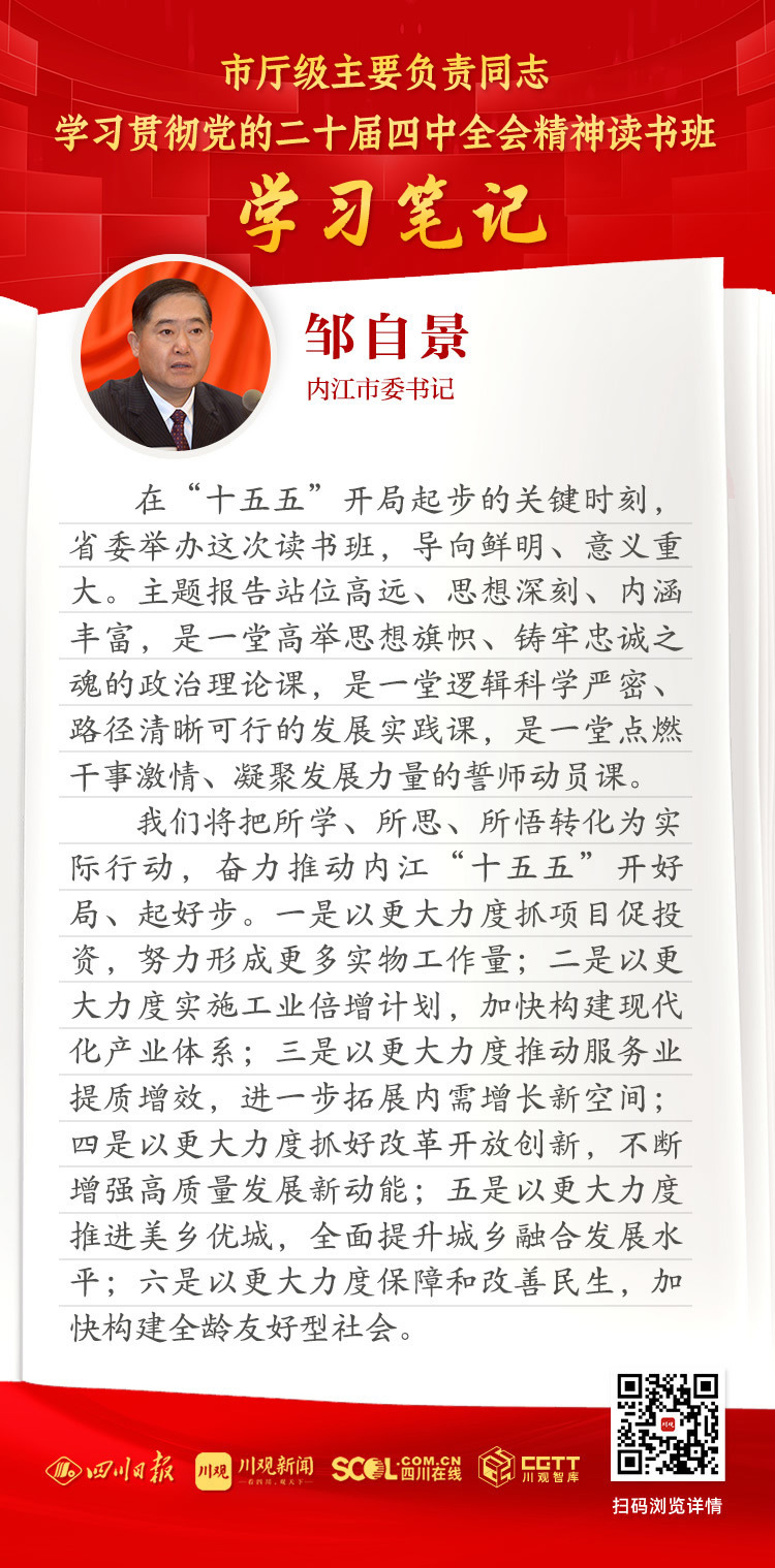 我们将把所学、所思、所悟转化为实际行动,奋力推动内江“十五五”开好局、起好步。一是以更大力度抓项目促投资,努力形成更多实物工作量;二是以更大力度实施工业倍增计划,加快构建现代化产业体系;三是以更大力度推动服务业提质增效,进一步拓展内需增长新空间;四是以更大力度抓好改革开放创新,不断增强高质量发展新动能;五是以更大力度推进美乡优城,全面提升城乡融合发展水平;六是以更大力度保障和改善民生,加快构建全龄友好型社会。