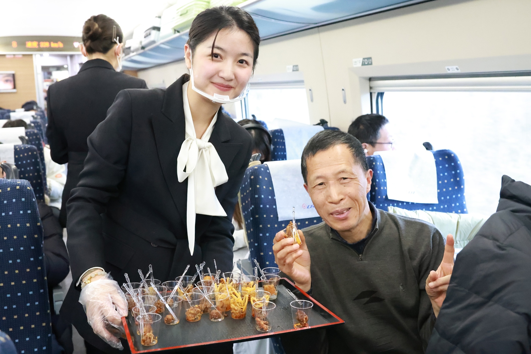 “没想到列车上也能吃到这么地道的川味小吃,冷吃兔的口感很正宗!”1月30日上午,泸州开往北京西的G970次列车餐吧车内,一场“美食伴您春运出行”主题活动温馨启幕。