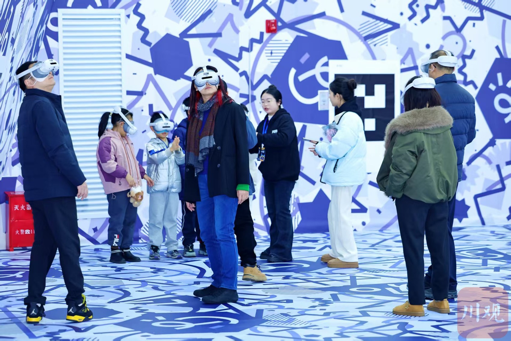 在“月宫计划”VR体验区,观众佩戴设备,沉浸式体验漫步月球、触摸月壤的奇妙旅程。