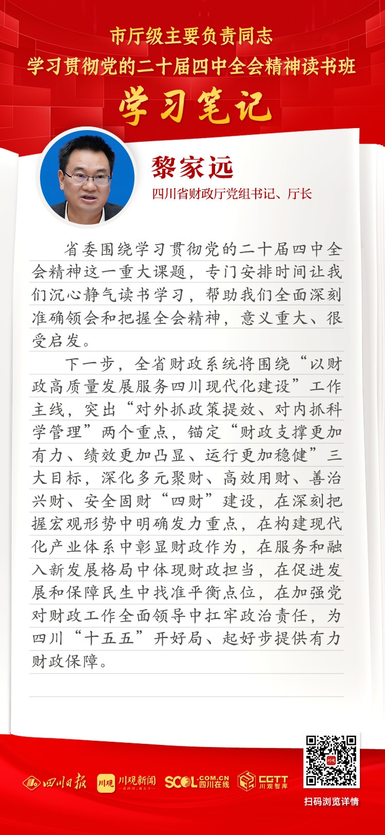 下一步,全省财政系统将围绕“以财政高质量发展服务四川现代化建设”工作主线,突出“对外抓政策提效、对内抓科学管理”两个重点,锚定“财政支撑更加有力、绩效更加凸显、运行更加稳健”三大目标,深化多元聚财、高效用财、善治兴财、安全固财“四财”建设,在深刻把握宏观形势中明确发力重点,在构建现代化产业体系中彰显财政作为,在服务和融入新发展格局中体现财政担当,在促进发展和保障民生中找准平衡点位,在加强党对财政工作全面领导中扛牢政治责任,为四川“十五五”开好局、起好步提供有力财政保障。