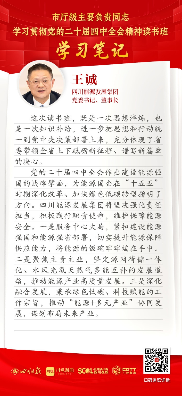 党的二十届四中全会作出建设能源强国的战略擘画,为能源国企在“十五五”时期深化改革、加快绿色低碳转型指明了方向。四川能源发展集团将坚决强化责任担当,积极践行职责使命,维护保障能源安全。一是服务中心大局,紧扣建设能源强国和能源强省部署,切实提升能源保障供应能力,将能源的饭碗牢牢端在手中。二是聚焦主责主业,坚定源网荷储一体化、水风光氢天然气多能互补的发展道路,推动能源产业高质量发展。三是深化融合发展,秉承绿色低碳、科技赋能的工作宗旨,推动“能源+多元产业”协同发展,谋划布局未来产业。