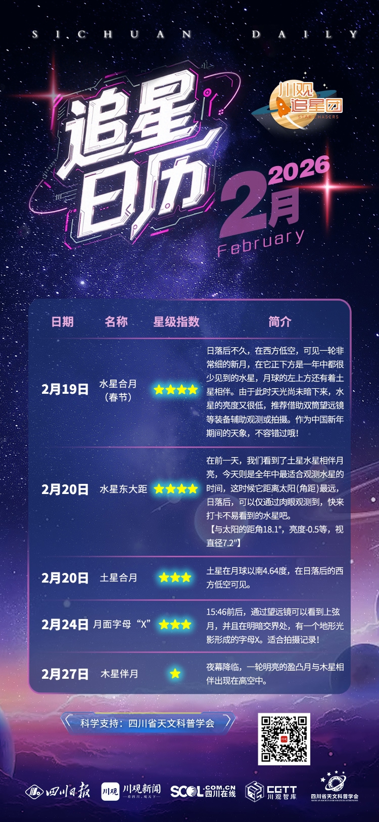 2月天宇浪漫上线,新春限定天象好戏连台。水星合月、年度最佳水星观测日、土星合月接连登场,还有木星伴月与趣味月面“X”彩蛋,星月相伴陪你欢度新春!