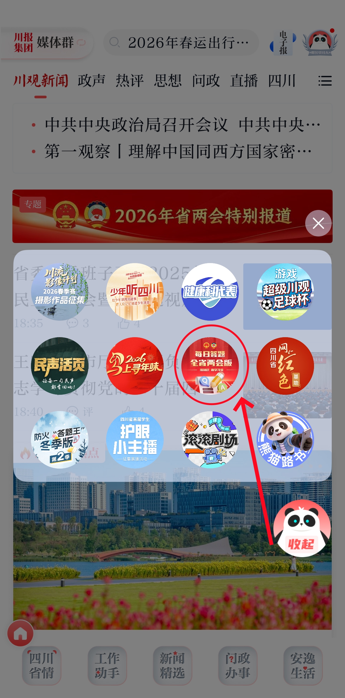 方式一:在川观新闻首页,点击右下方悬浮球,找到“每日答题全省两会版”活动图片即可参与;