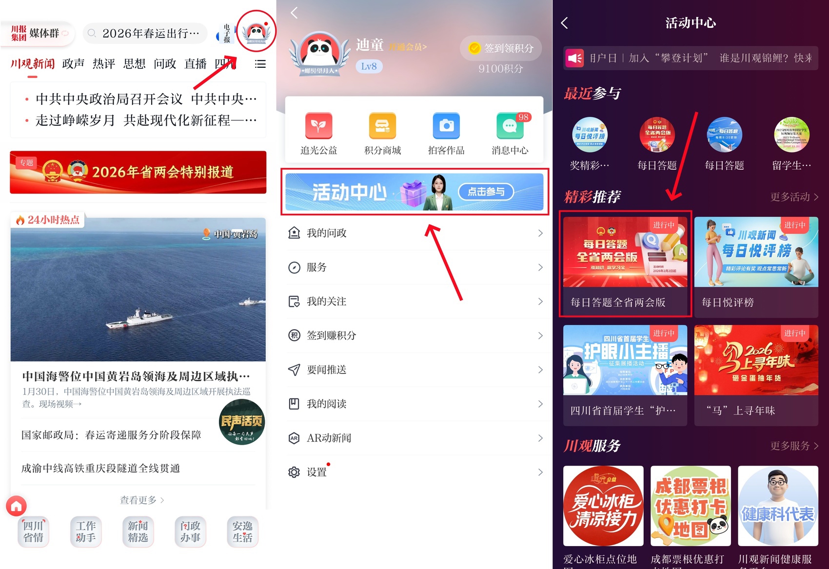 方式二:打开川观新闻App,点击首页右上角头像选择“活动中心”,进入选择“每日答题全省两会版”按钮,点击进入活动。