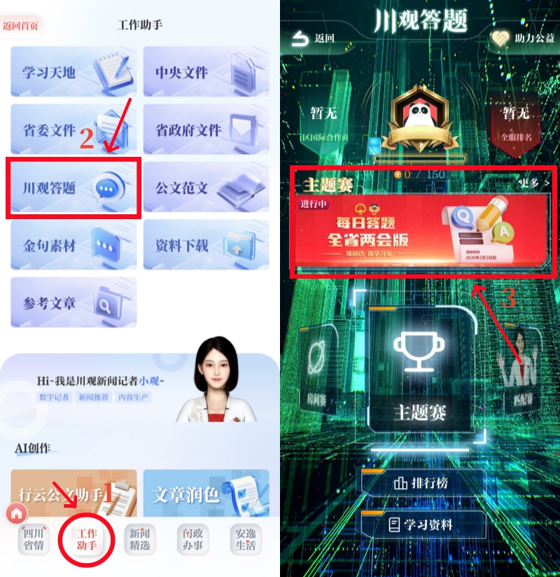 方式三:在川观新闻下方任务栏点击“工作助手”,进入“川观答题”栏目,点击“每日答题全省两会版”图标即可进入答题页面。
