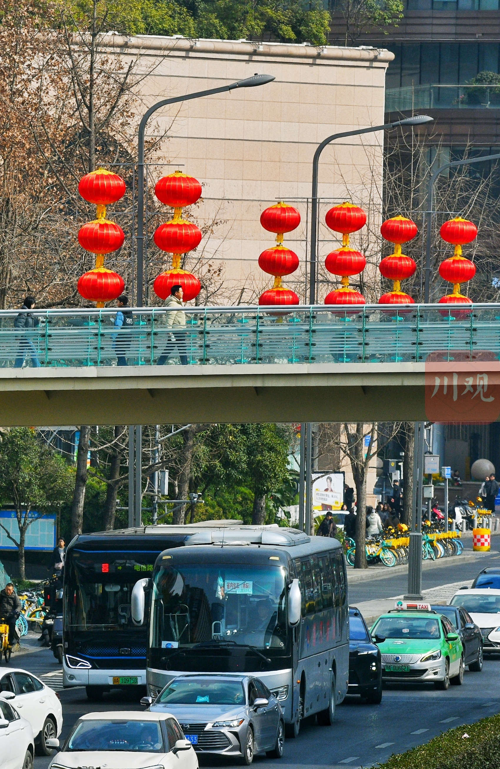 2月1日,冬日蓉城,暖意融融。蜀都大道上,春节氛围装点工作已启动。施工人员将一组组大红灯笼(每组6个)精心悬挂于主干道两侧。红灯映暖阳,满城气象新,热烈的节日气息扑面而来。