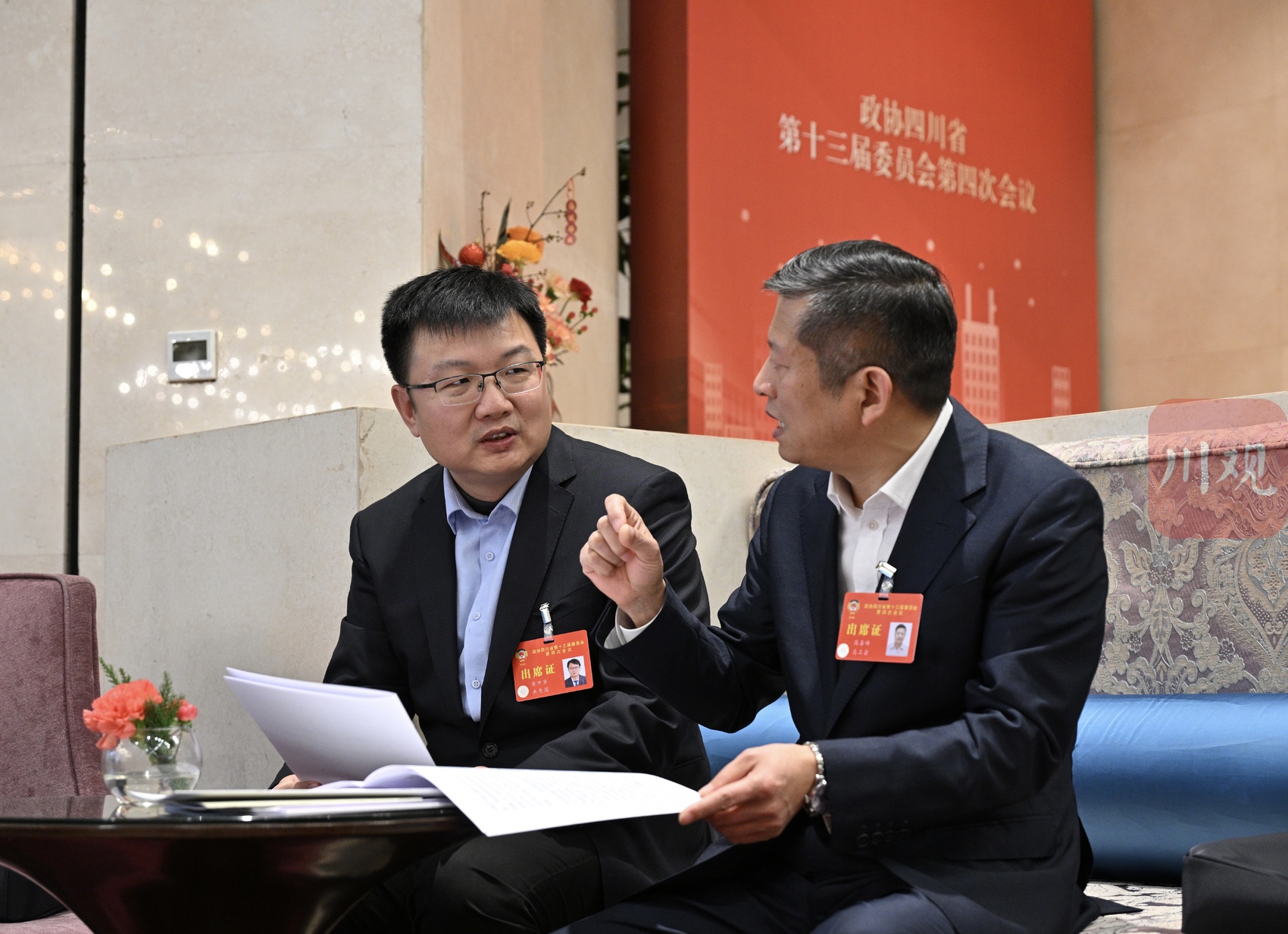 报到结束后,李开华委员(左)和高善峰委员(右)在驻地交流提案内容。