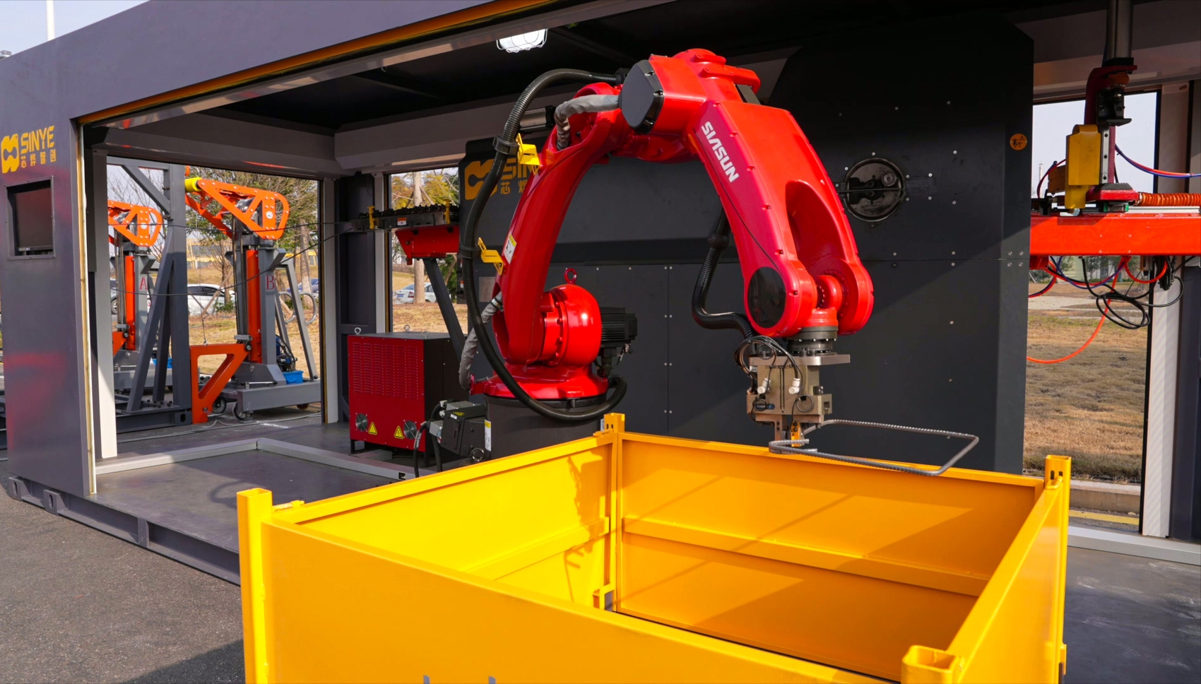 钢筋智能加工机器人是全国首个可快速部署、数智化加工的项目级智能钢筋加工装备。该机器人相当于一座“可移动的小型钢筋加工厂”,通过集装箱转运所有设备和材料,机器调试最快只需2小时,导入订单后即可自动开始生产,这一模式将全面革新钢筋加工。