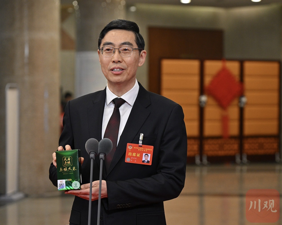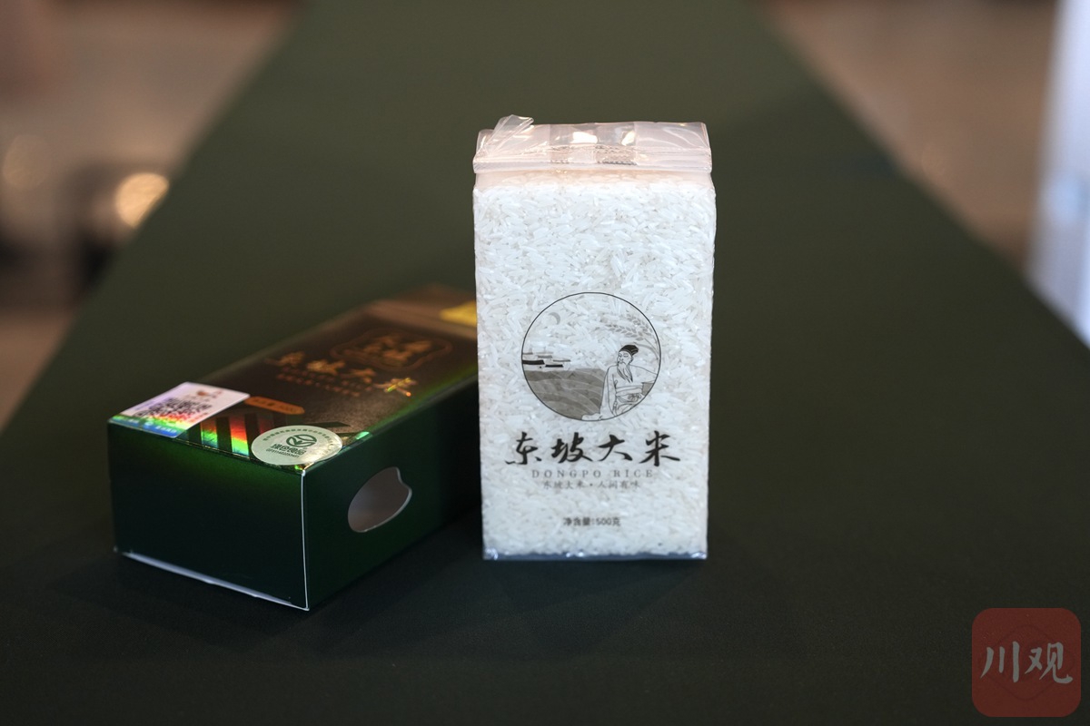 回答问题时,黄剑东从文件袋里掏出了一袋小包装大米。“我这次专门带来了我们眉山的东坡大米,和大家分享。”他展示着手中的大米,“大家看,它颗粒饱满、晶莹如玉、口感很好,是绿色食品,今年还将取得有机认证。”