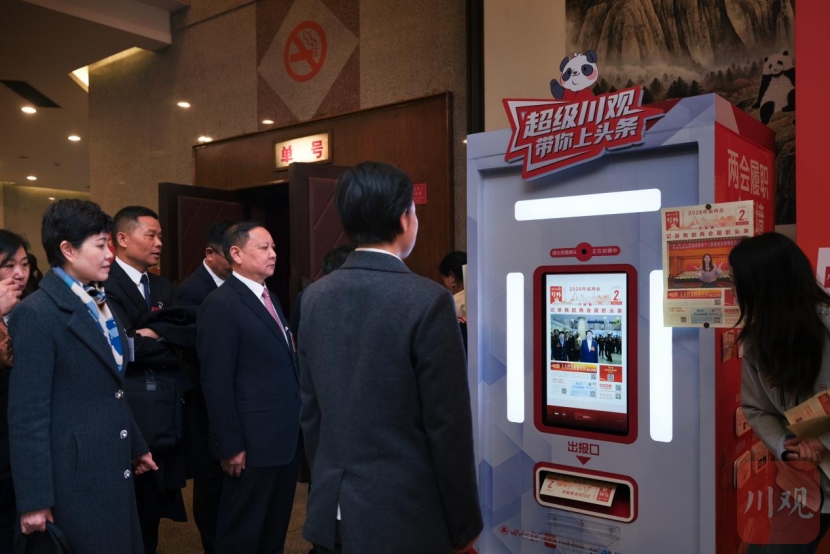 “3、2、1!”倒计时结束后,在这台标志性“川观红”的互动照相打印机前,委员们的履职身影便定格在会场中央,通过AI技术合成和美化,迅速生成一张委员们专属的“两会履职头条”珍藏版四川日报号外纪念报。