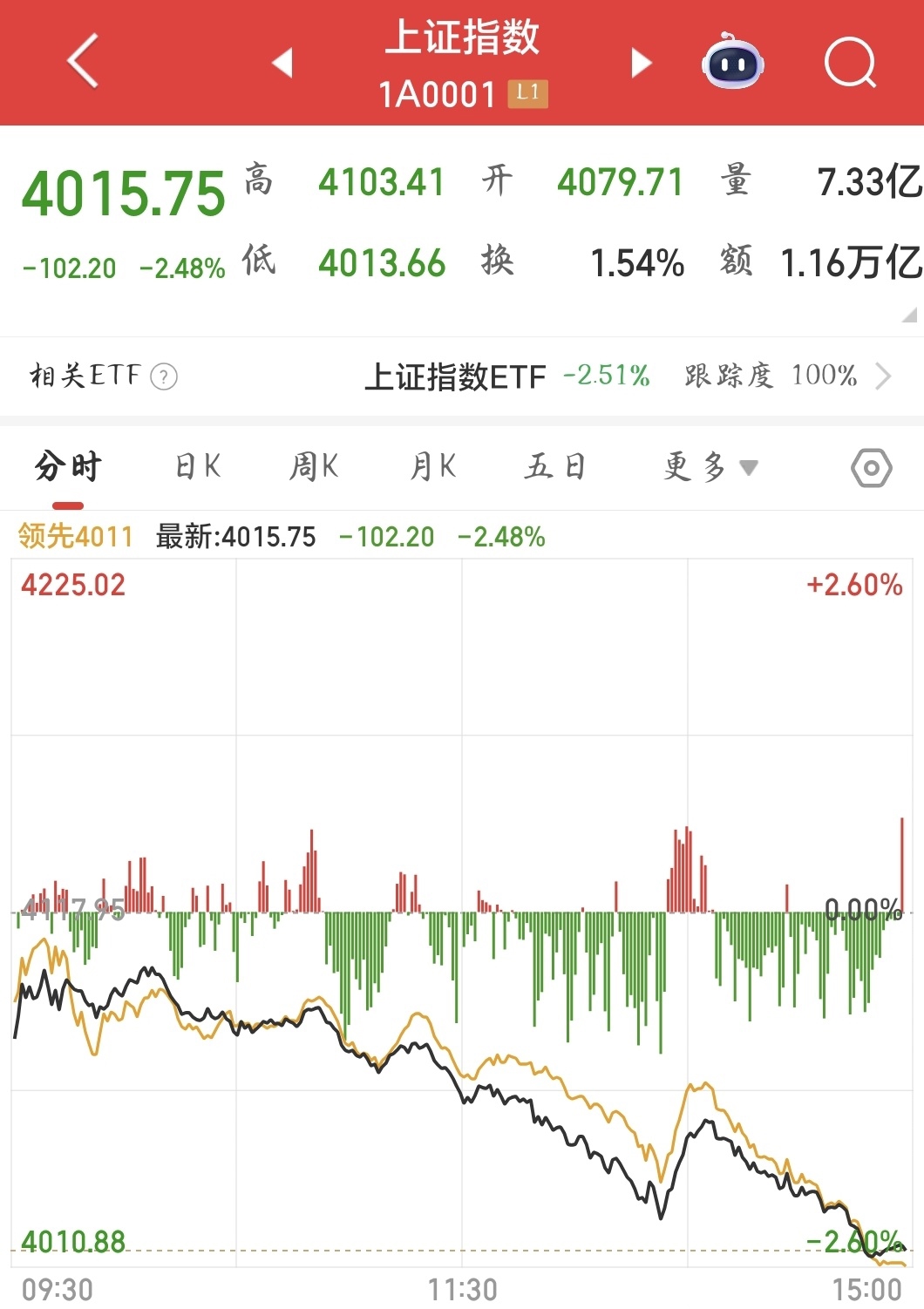 2月2日,A股二月行情迎来逆风开局,全天维持震荡调整态势,三大核心指数同步下挫,跌幅均突破2%,整体盘面呈现弱势格局。截至收盘,上证指数下跌2.48%,收于4015.75点;深证成指是13824.35点,跌幅2.69%;创业板指是3264.11点,跌幅2.46%,三大指数均创下近期调整新低。