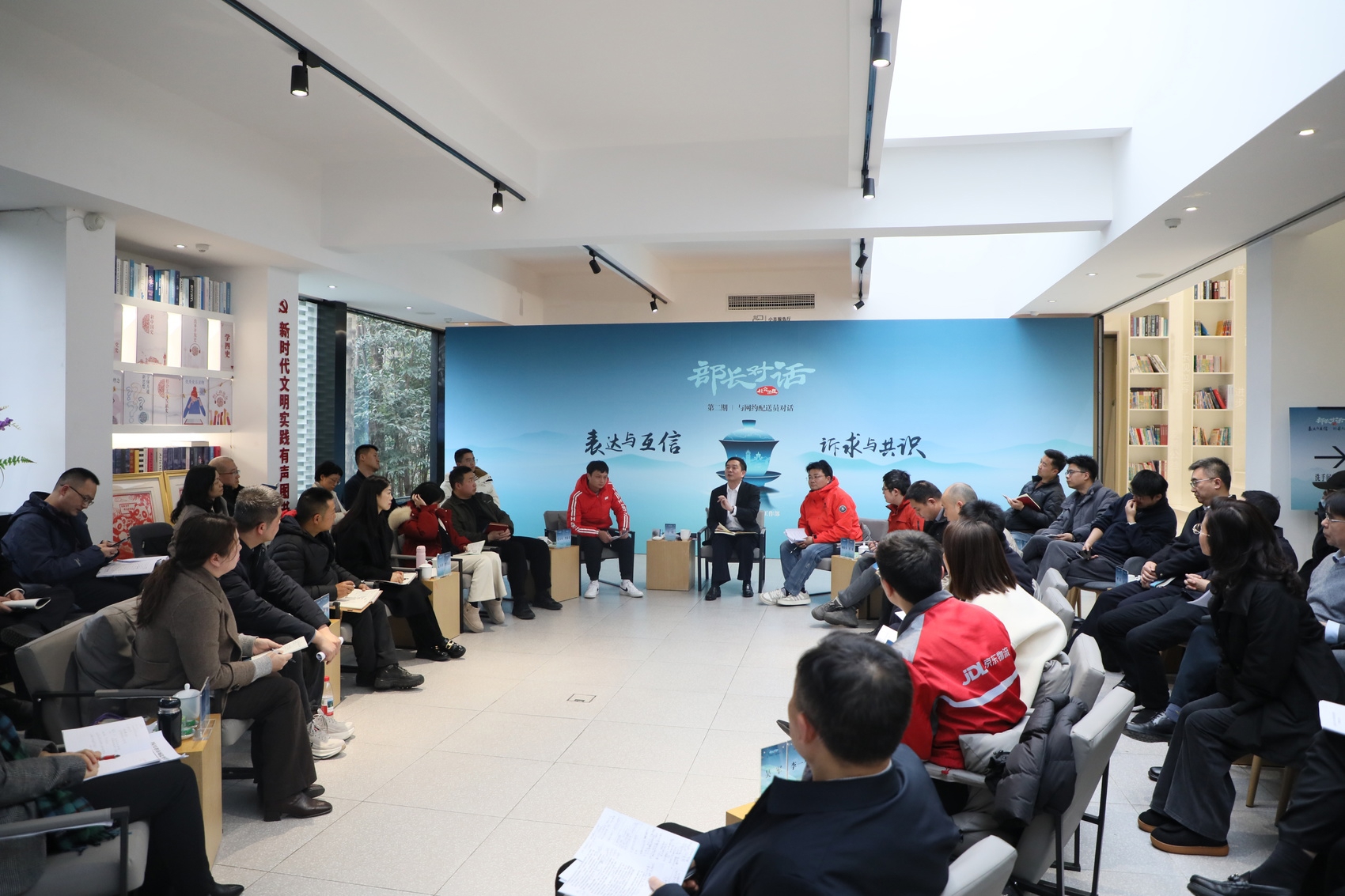 下午2点半,锦江区新时代文明实践公园·山上文明里,四川省委社会工作部“部长对话”第二期在这里举行,陈欢与另外三位骑手相遇——四人中有三人不约而同穿着红色外套,在这个不大的会场里格外显眼,“穿鲜艳点成了大家的职业习惯。”