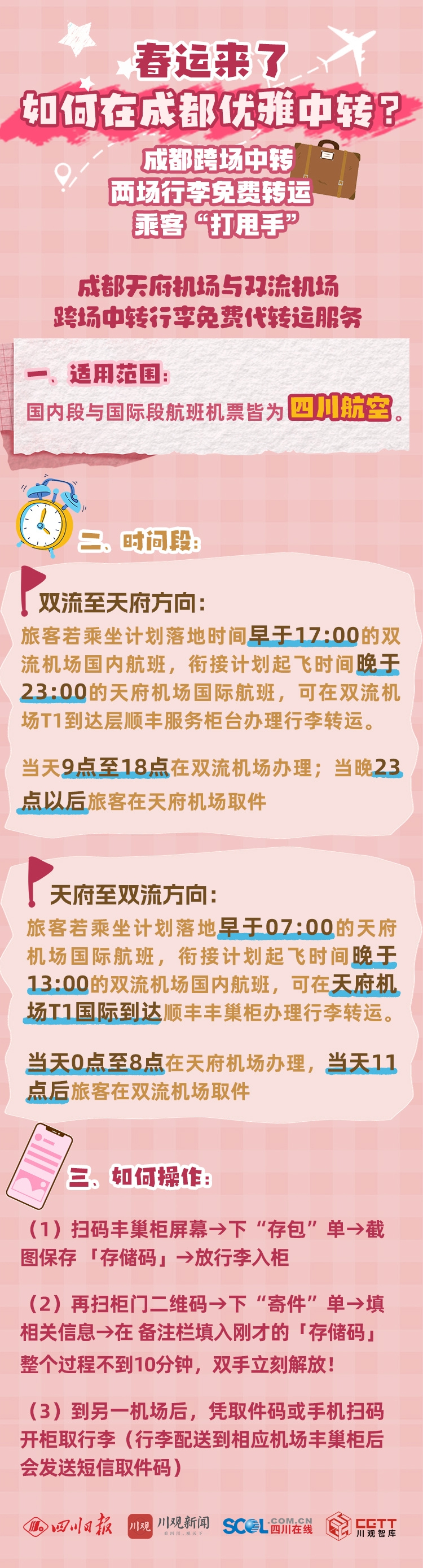 该项“打甩手”服务,是四川航空联合双流机场、天府机场,以及顺丰速运,推出的成都天府机场与双流机场跨场中转行李免费代转运服务。旅客购买符合时间衔接标准的四川航空双流机场国内段与天府机场国际段航班机票,就可以享受免费的行李代转运服务,实现“甩手中转”。