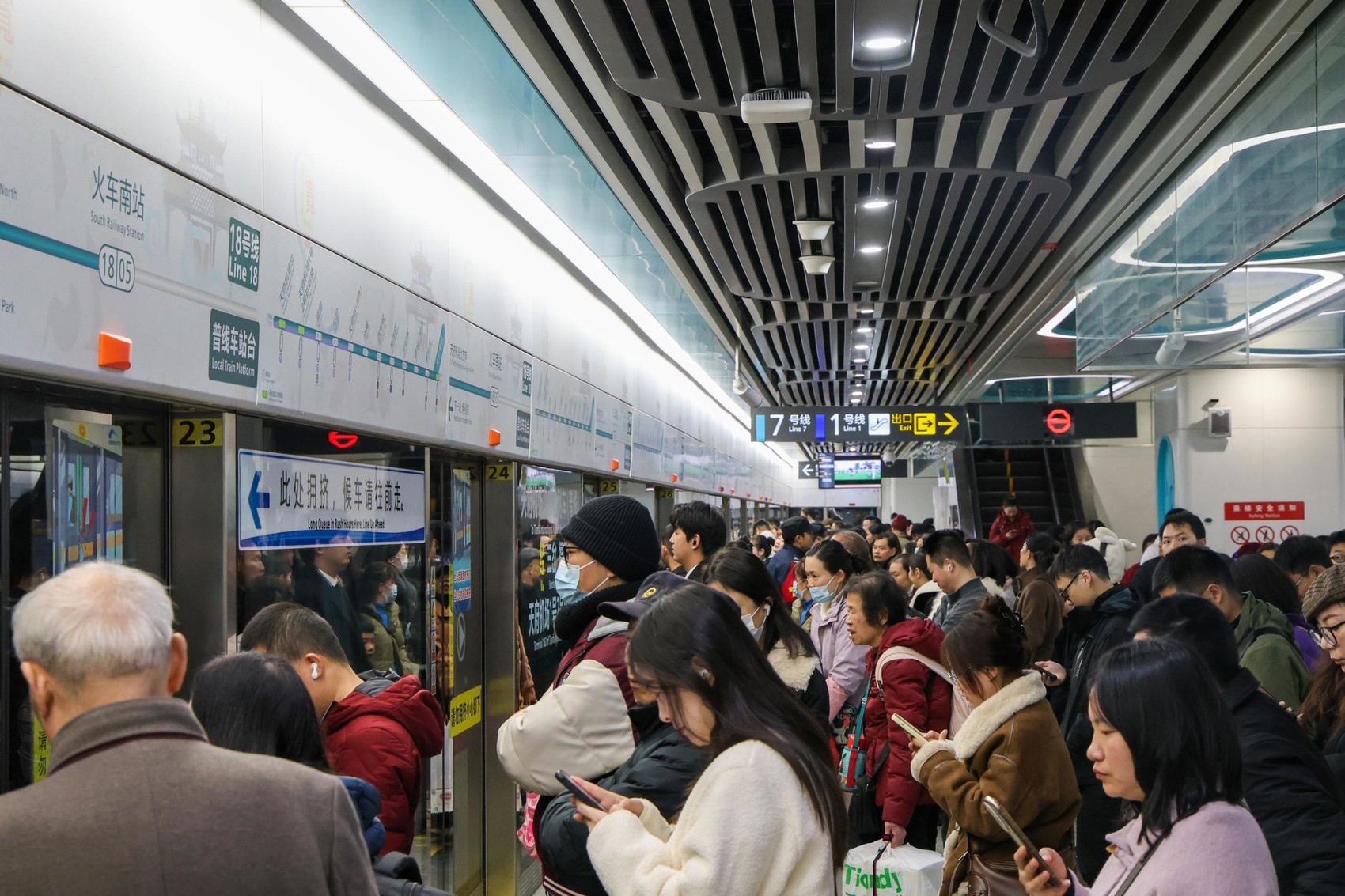 2月2日,成都春运首日,地铁成都东客站、火车南站等车站内,客流涌动,火红的窗花勾勒回家暖意。