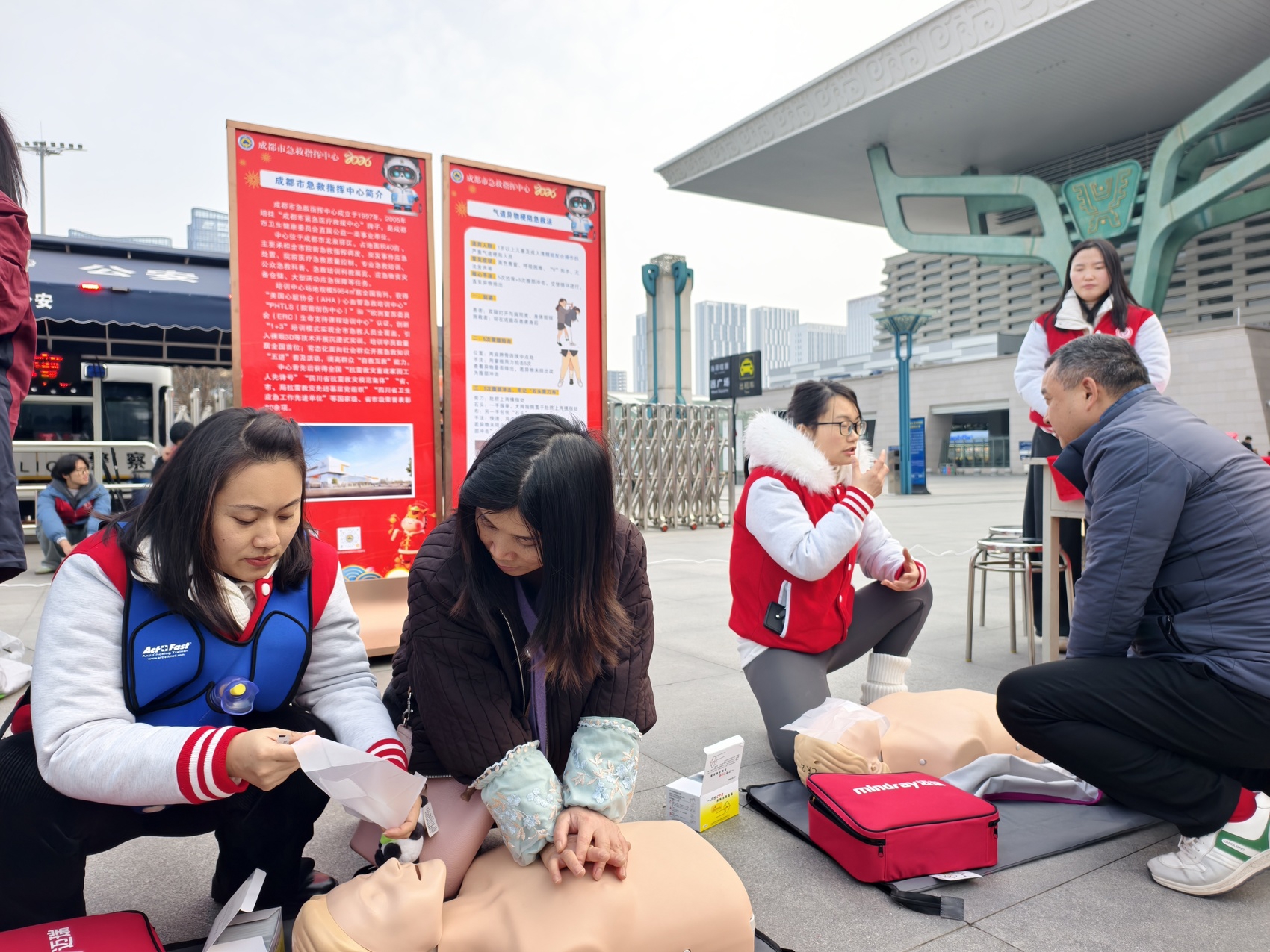 急救技能实操是此次健康服务活动的重点内容之一,成都东站出发大厅及西广场设有 “救在身边” 体验区,成都市急救中心救护人员与志愿者借助心肺复苏模拟人、AED训练机等器材,手把手指导旅客实操心肺复苏、海姆立克急救法等技能。