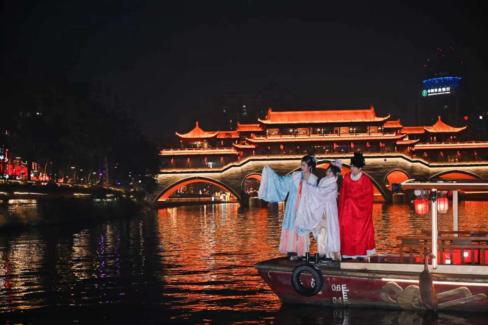 作为成都备受欢迎的文旅项目,夜游锦江已有20公里水上游线,北起活水公园,南至江滩公园,按照“一码头一场景”“一码头一主题”进行差异化场景构建及业态引入,打造“日游+夜游”消费场景,构建起“老成都、蜀都味、国际范”兼备的旗舰级城市阳台主题文化消费空间。