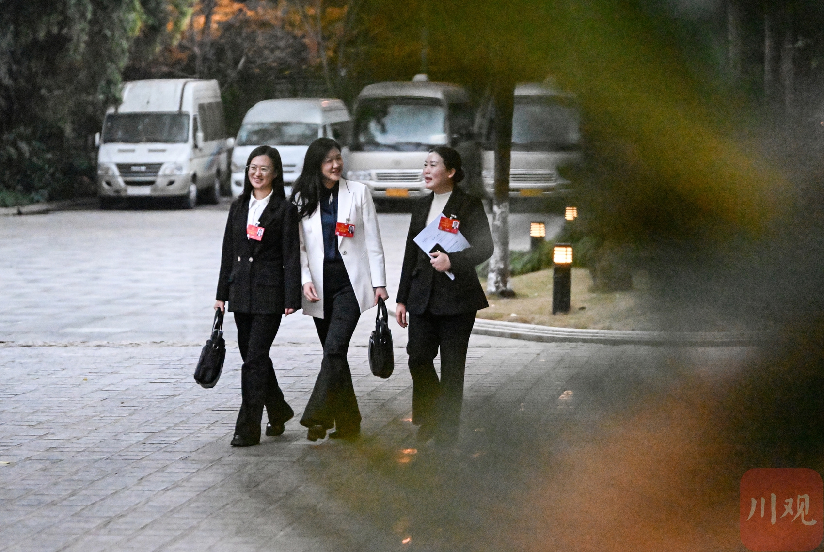 2026年2月5日,省人大代表刘莉莎(左)、王小莉(中)、万学(右)从分组会场出来后交流履职心得,讨论“关于升级小区车库消防安全设施的建议”。