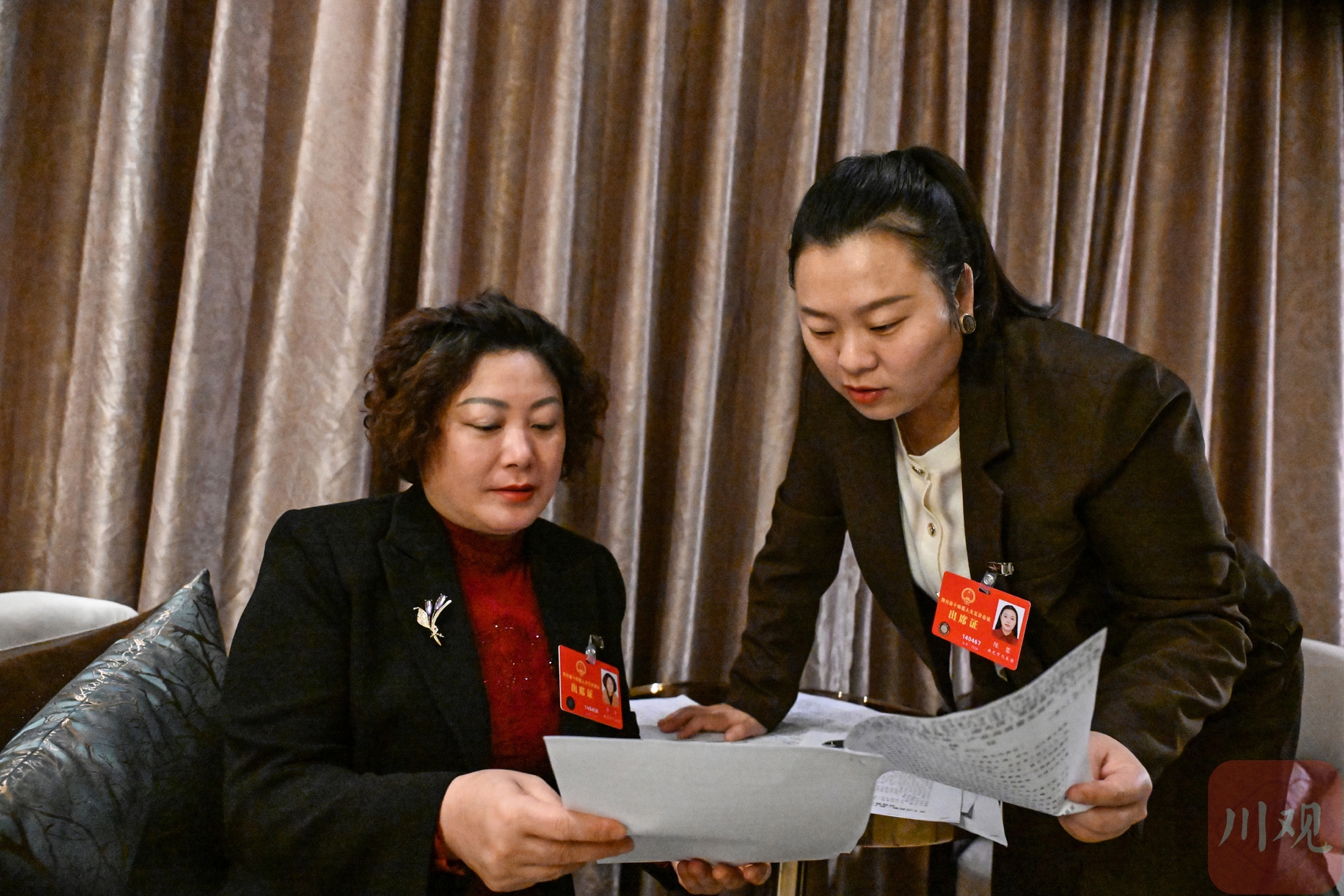 2026年2月5日晚,省人大代表李华(左)、陈蓉(右)进一步完善“关于为偏远中心镇配备急救车辆提升农村医疗应急能力的建议”“关于统筹打造嘉陵江(南充段)旅游黄金环线全面带动第三产业高质量发展的建议”,为发言做充分准备。