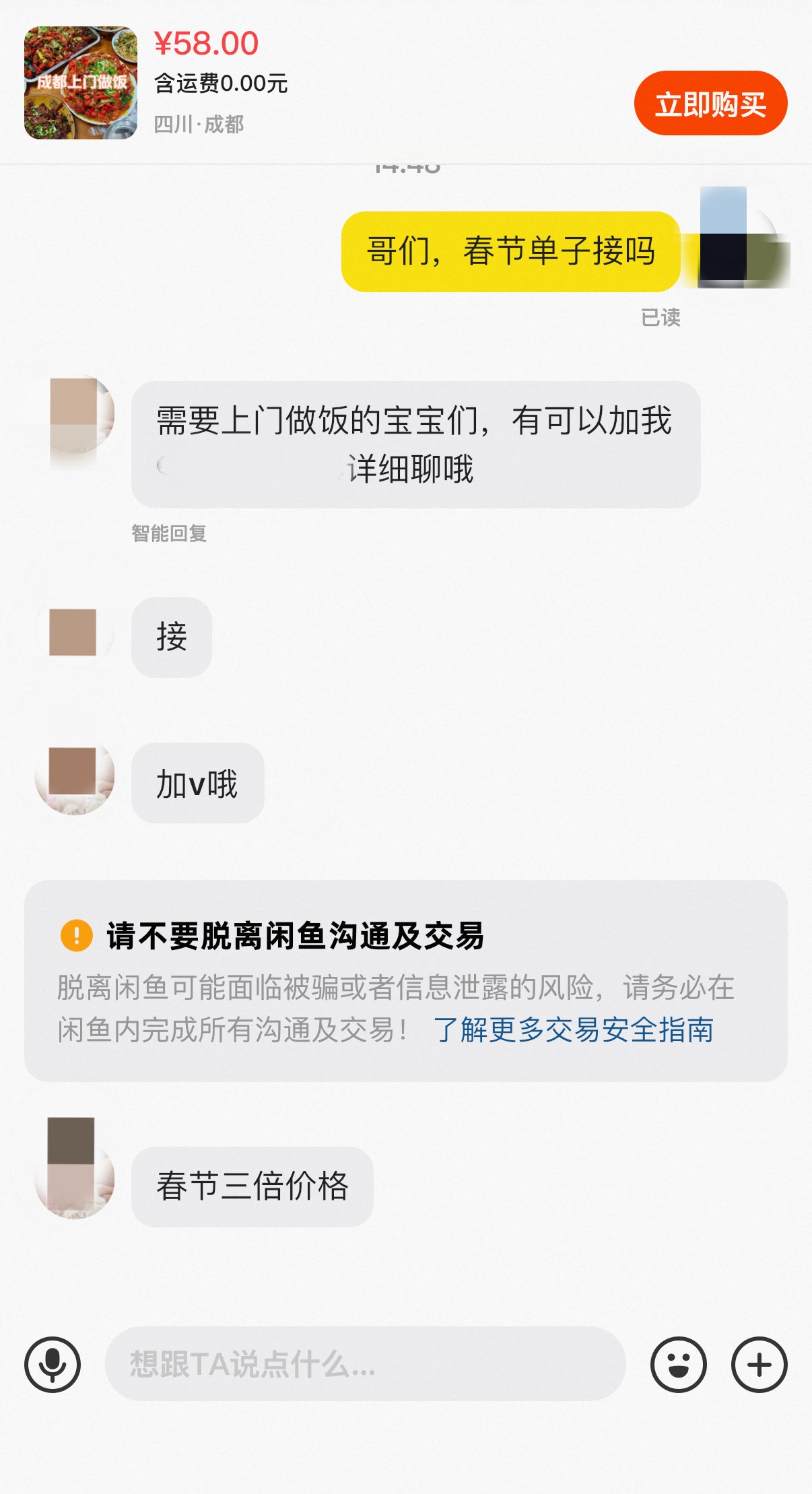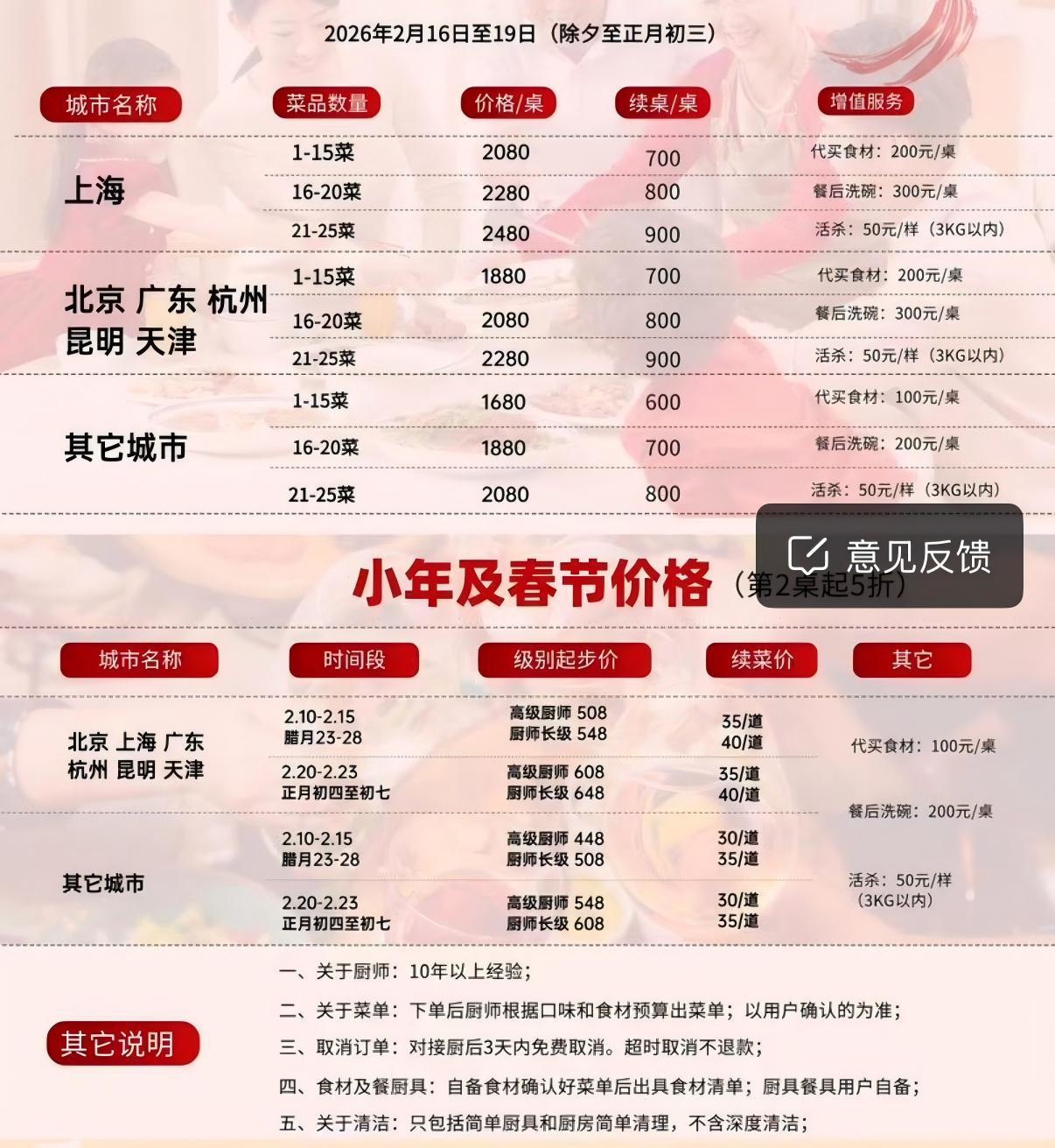 各大平台的私厨预约格外火爆。记者实际联系美团、大众点评等生活服务平台上的多家私厨店铺,工作人员均明确表示,春节期间平台团购套餐无法使用,餐食需按节日定制价单独核算;而小红书、闲鱼等平台的个人私厨,也坦言春节期间服务价格较平时上涨,且除夕、初一等热门档期已经约满。