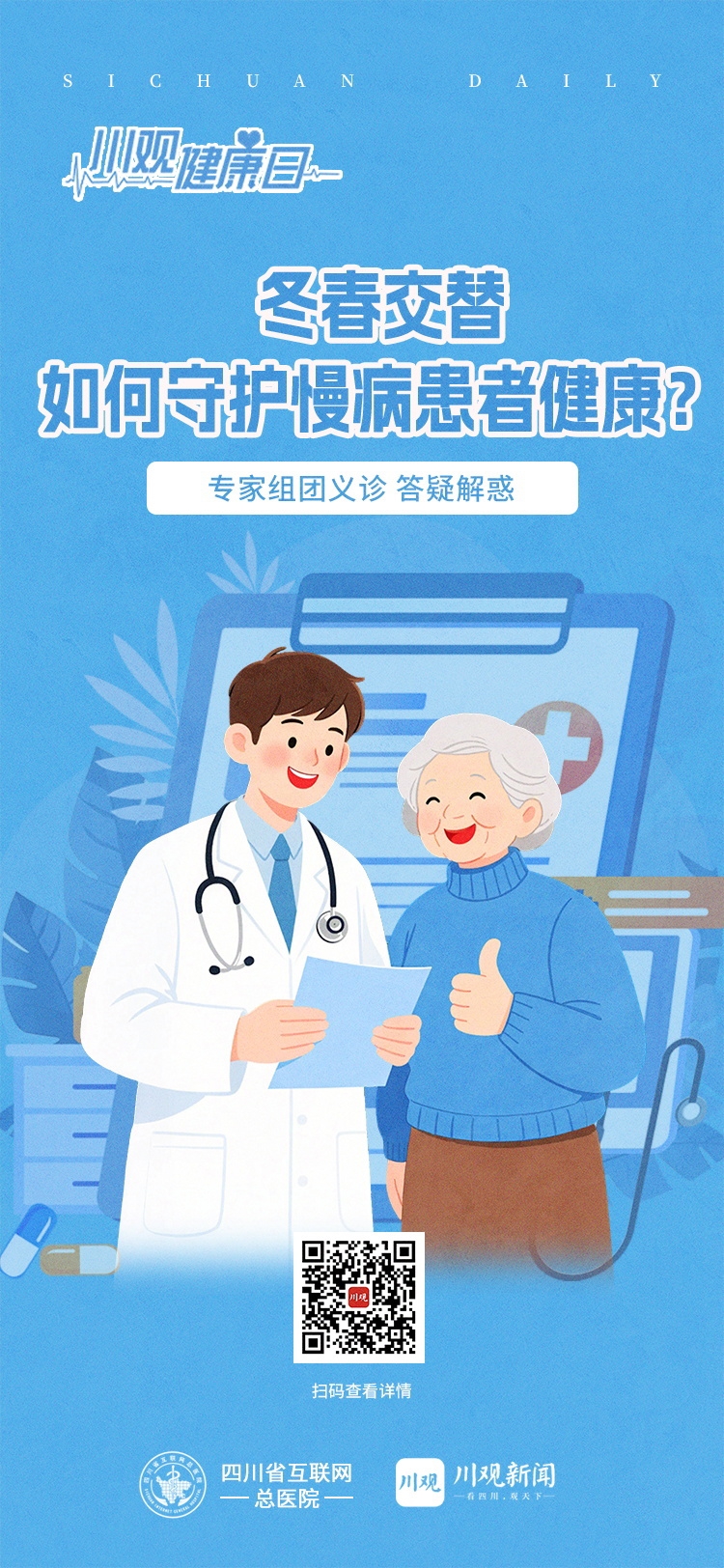 2026年2月8日,川观健康日,川观新闻携手四川省互联网总医院开展线上免费义诊活动,送出200个线上免费义诊名额,四川大学华西医院、四川护理职业学院附属医院(四川省第三人民医院)、四川省妇幼保健院、川北医学院附属医院、成都中医药大学附属医院和四川省中西医结合医院的专家将在线答疑。