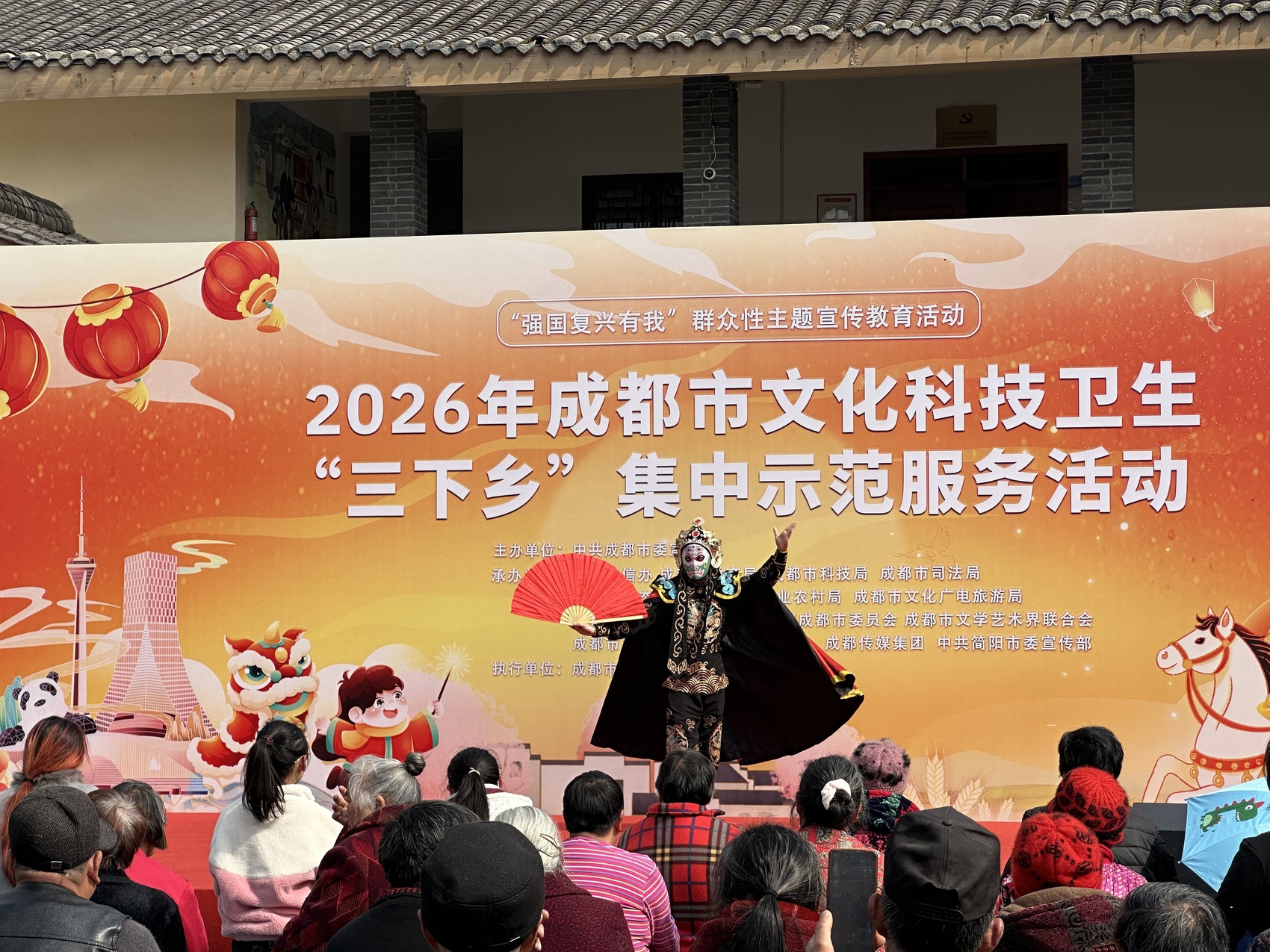 2月4日、6日,由成都市委宣传部联合市文广旅局、市卫健委等18个市级(单位)联合开展的2026年成都市文化科技卫生“三下乡”集中示范活动,相继在简阳市前锋村、协议村举行。活动给乡村带来浓浓的年味,丰富了群众的精神文化生活。