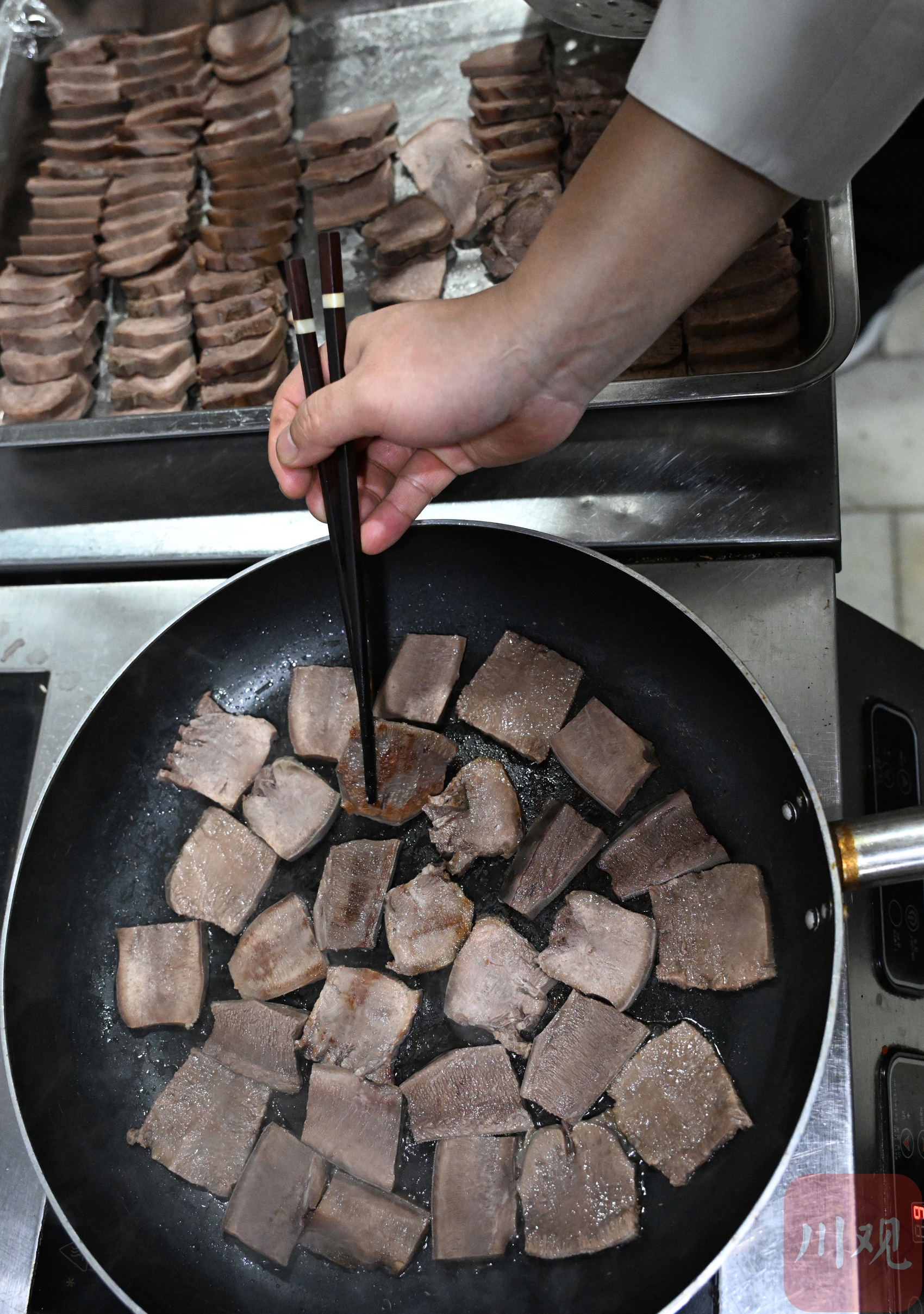 凉菜四拼盘、烧椒西冷、清汤牛腱炖萝卜、怪味牛排、姜汁牛头方、牛舌花椒酱、蹄筋燕窝等十道特色菜肴,展现了“雅江雪牛”不同部位的多样口感。记者走进厨房,见到厨师们以牛肉为主要食材,在口味、质地、造型、色泽与创新方面精心烹制,力求在选材与呈现上推陈出新,赢得了现场嘉宾的一致好评。