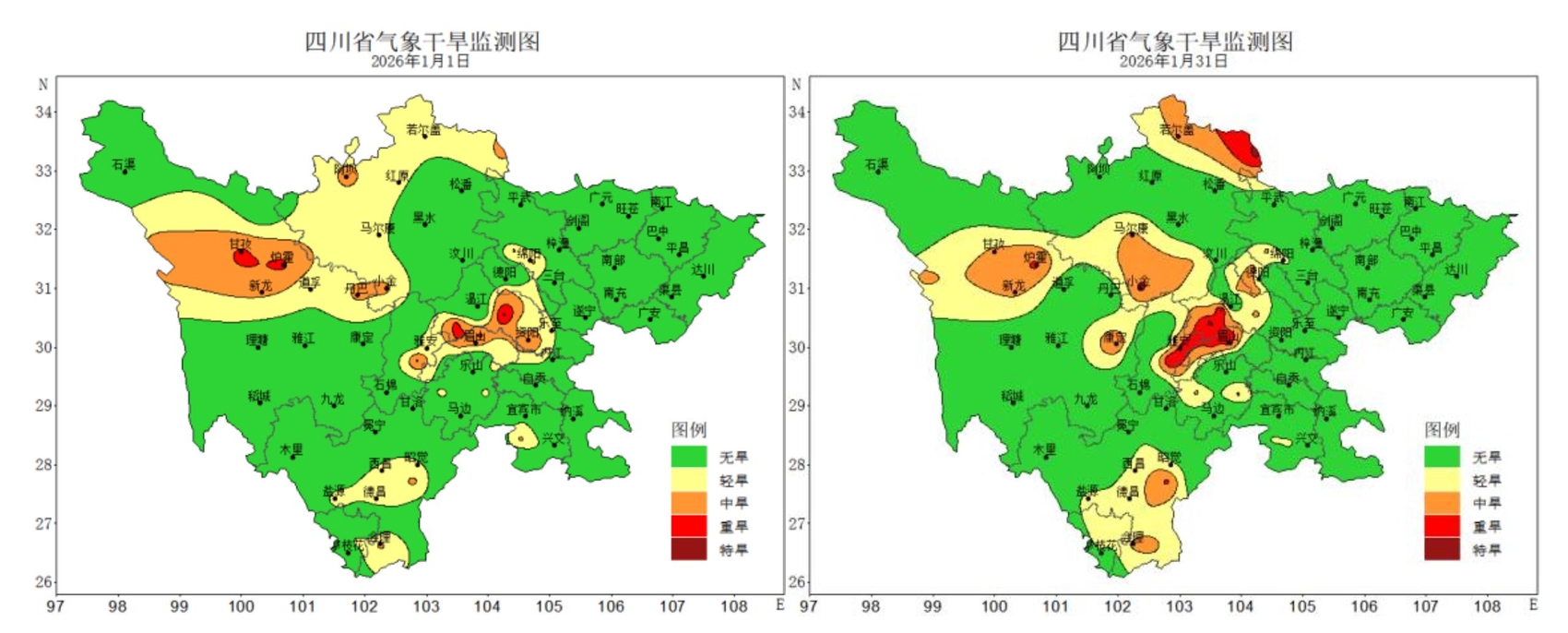 2026年1月1日(左)和1月31日(右)四川省气象干旱分布图。图据四川省气候中心