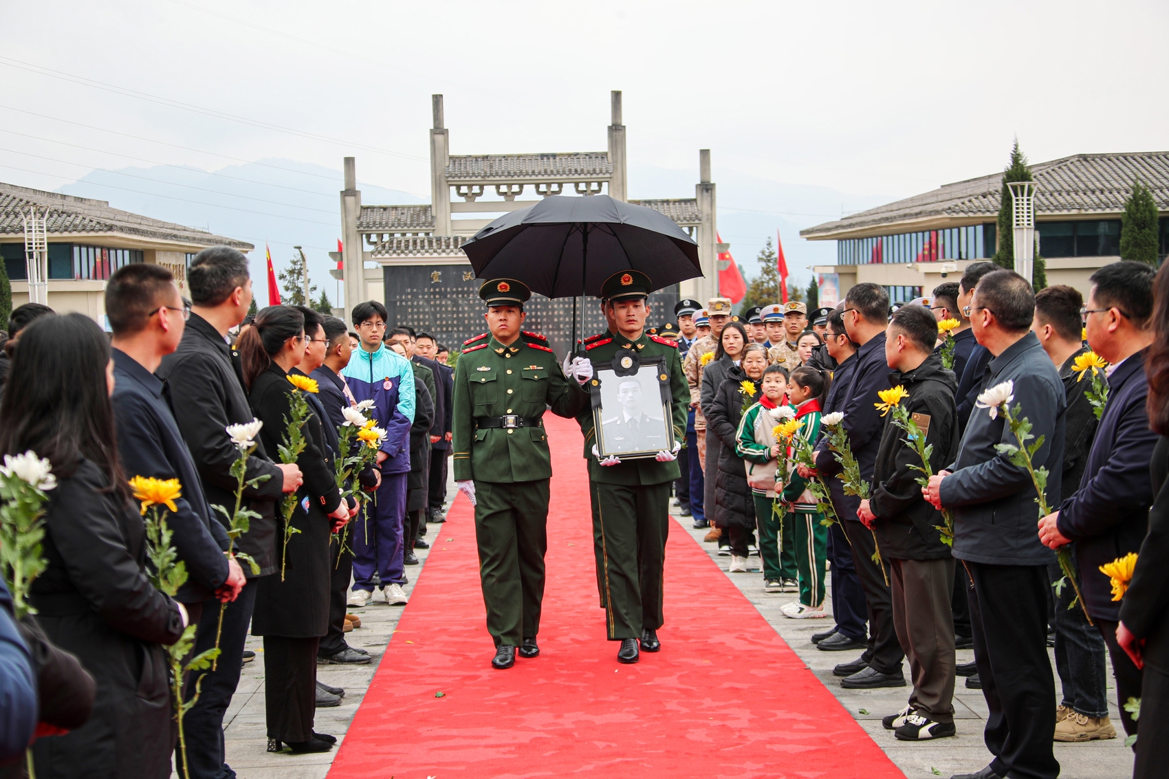 安葬仪式开始,礼兵撑着黑伞,缓步将谯禾林烈士遗像及覆盖着鲜艳国旗的骨灰盒护送至仪式主礼台前。