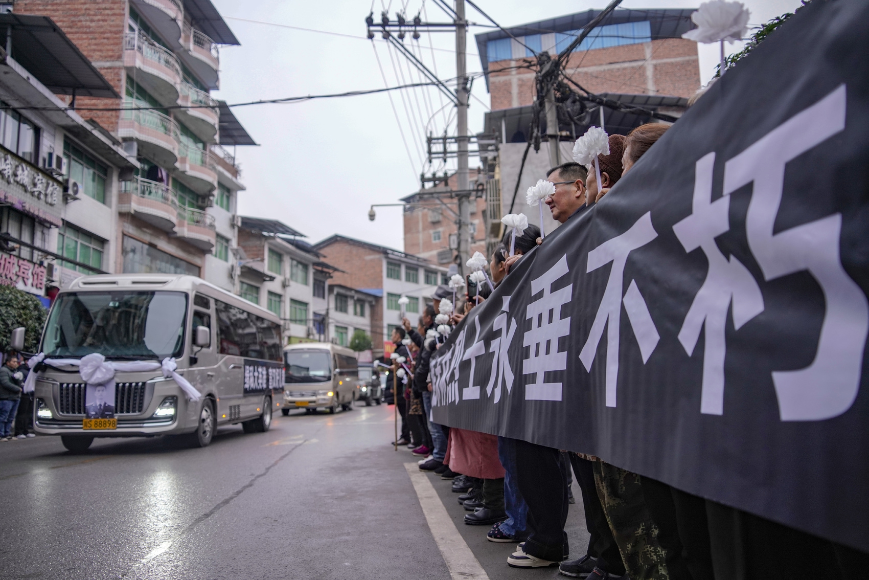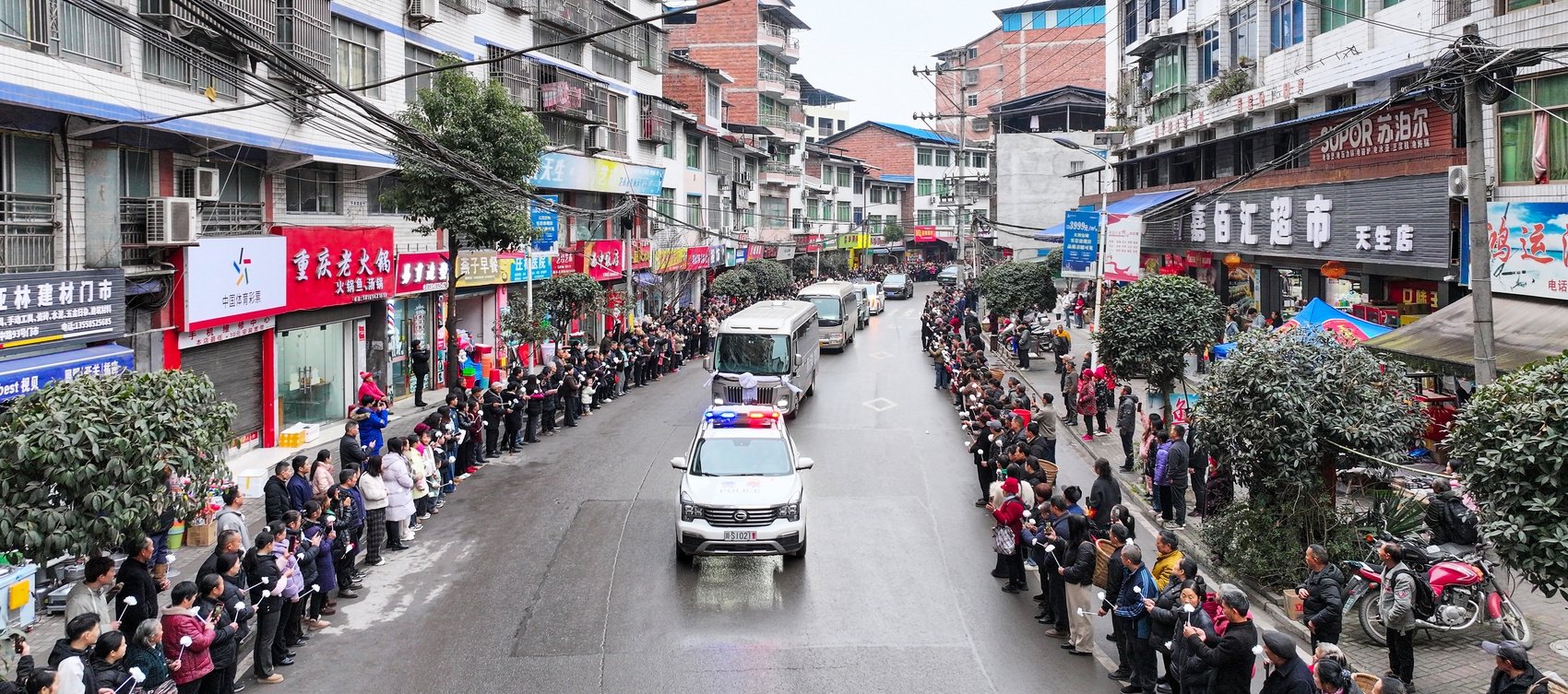 他们怀着沉痛和崇敬的心情,神情肃穆,目光望向灵车将要驶来的方向。不少居民拉着黑底白字横幅,上面写着“宣汉人民迎接谯禾林烈士回家”。