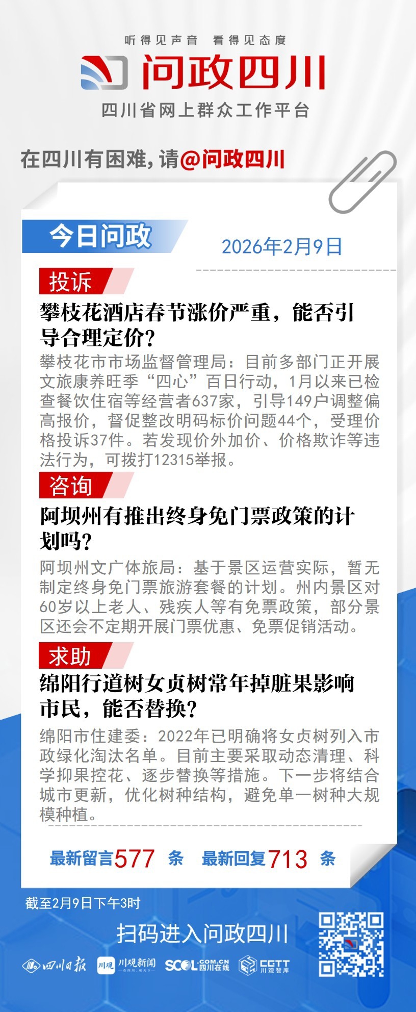 在四川有困难,找问政四川。如果您在四川遇到了操心事、烦心事、揪心事,请登录“四川省网上群众工作平台—问政四川”或拨打问政四川热线(028-96001)留言反映、求助或建议。我们将充分发挥平台的互动联系作用及舆论监督功能,第一时间传递民声,推动问题得以及时解决——听得见声音,看得见态度。