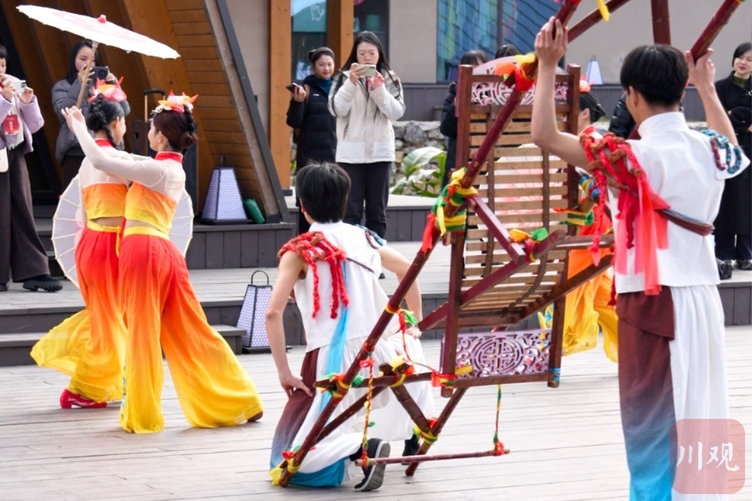 今年春节,游客可以在“十里芳菲·红岩美村”观赏民俗表演“华蓥山滑竿抬幺妹”。