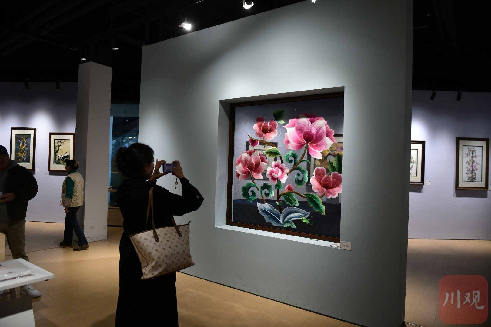 踏入天府艺境国绣馆,一幅幅精美的藏羌织绣作品映入眼帘。在展厅一角,绣娘吴雨桐穿引着彩线,花瓣在她手中渐次鲜活。她完成一幅菊花图需两三个月,之后将对外销售。