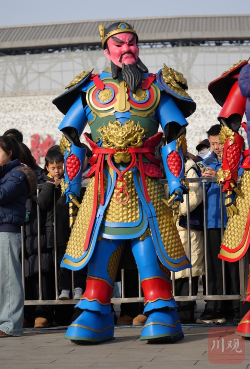 巡游现场,绵竹年画中家喻户晓的武门神、福、禄、寿、喜、财等经典形象纷纷“穿”上高达2.8米的科技机甲,与从清代《迎春图》中走出的牧童、春官、知县等传统人物并肩前行。这场“画里游春·绵竹寻年”主题巡游,将清代画卷《迎春图》的四百多个人物仪轨与创意机甲巧妙相融,完整演绎“迎春、游春、报春、打春”的春节序列。“老鼠嫁女”的诙谐、“年画机甲”的震撼、“打春祈福”的喜庆,以及多彩的藏羌彝风情表演,共同绘就了一幅跨越古今的生动年俗画卷。