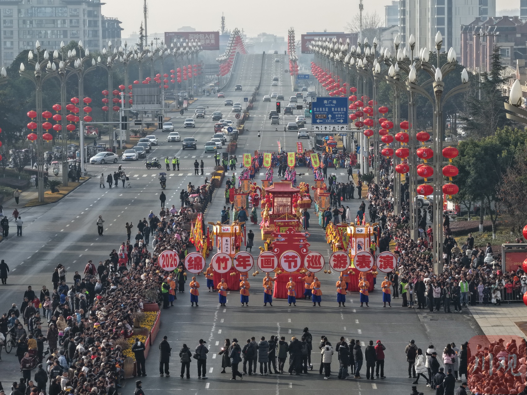 2月10日,第25届绵竹年画节在绵竹市体育中心广场开幕,年画节巡游表演同步上演,为市民和游客带来浓浓年味。