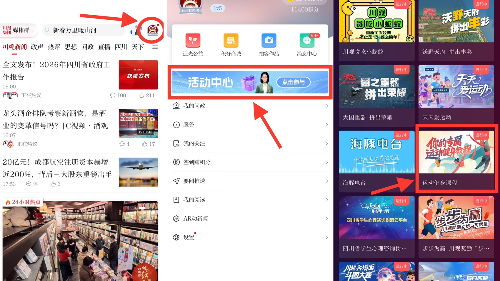 打开川观新闻App,首页右上角点击“我的头像”按钮,选择“活动中心”,进入找到“运动健身课程”,点击即可进入。