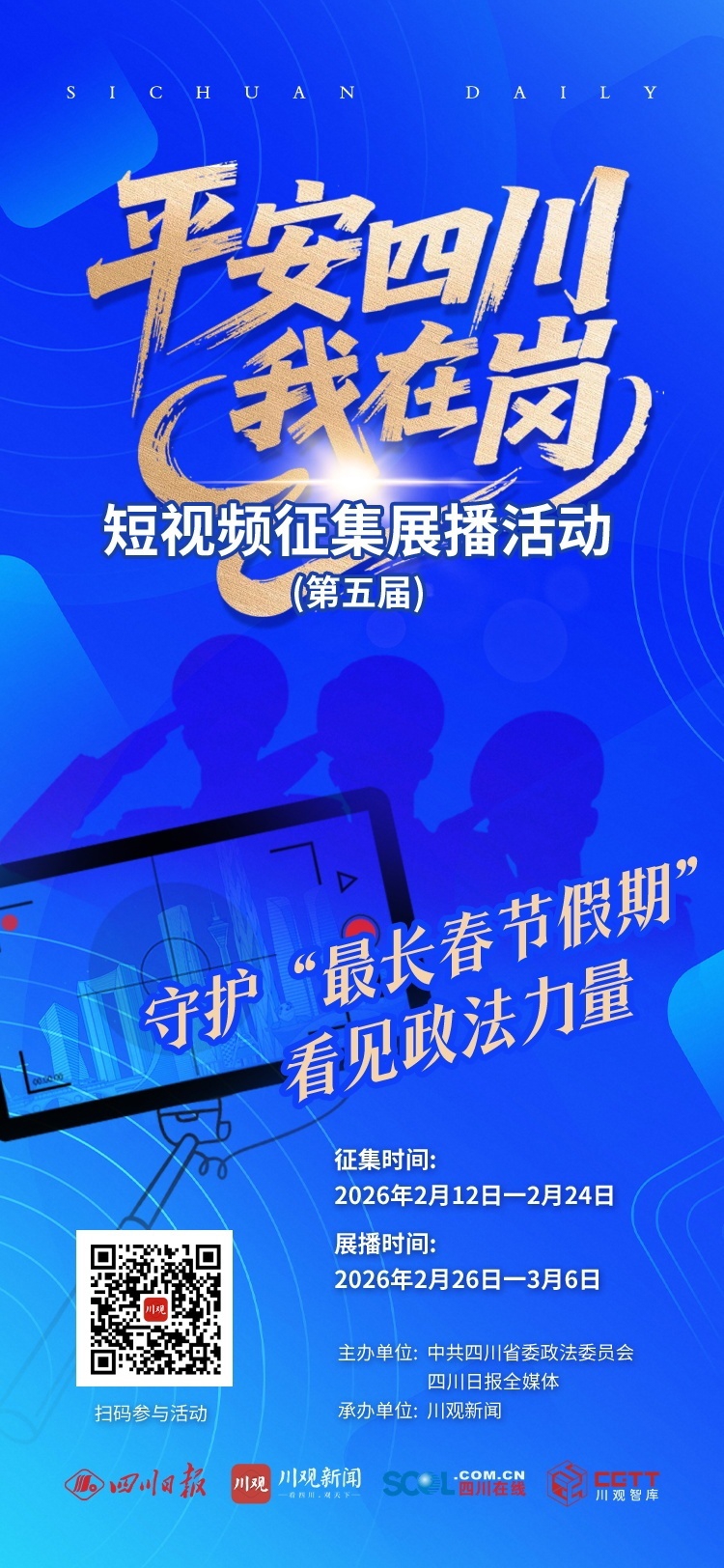 最长春节假期即将来临,四川日报全媒体继续携手中共四川省委政法委员会,共同开启第五届“平安四川我在岗”短视频征集展播活动,诚邀全省政法干警与广大网友,以镜头为笔、以光影为墨,定格节日里的暖心守护——拍下政法铁军坚守一线、服务群众的动人瞬间,用展播与点赞,向每一位在岗守护者致敬,让平安力量被更多人看见、被更多人点赞!