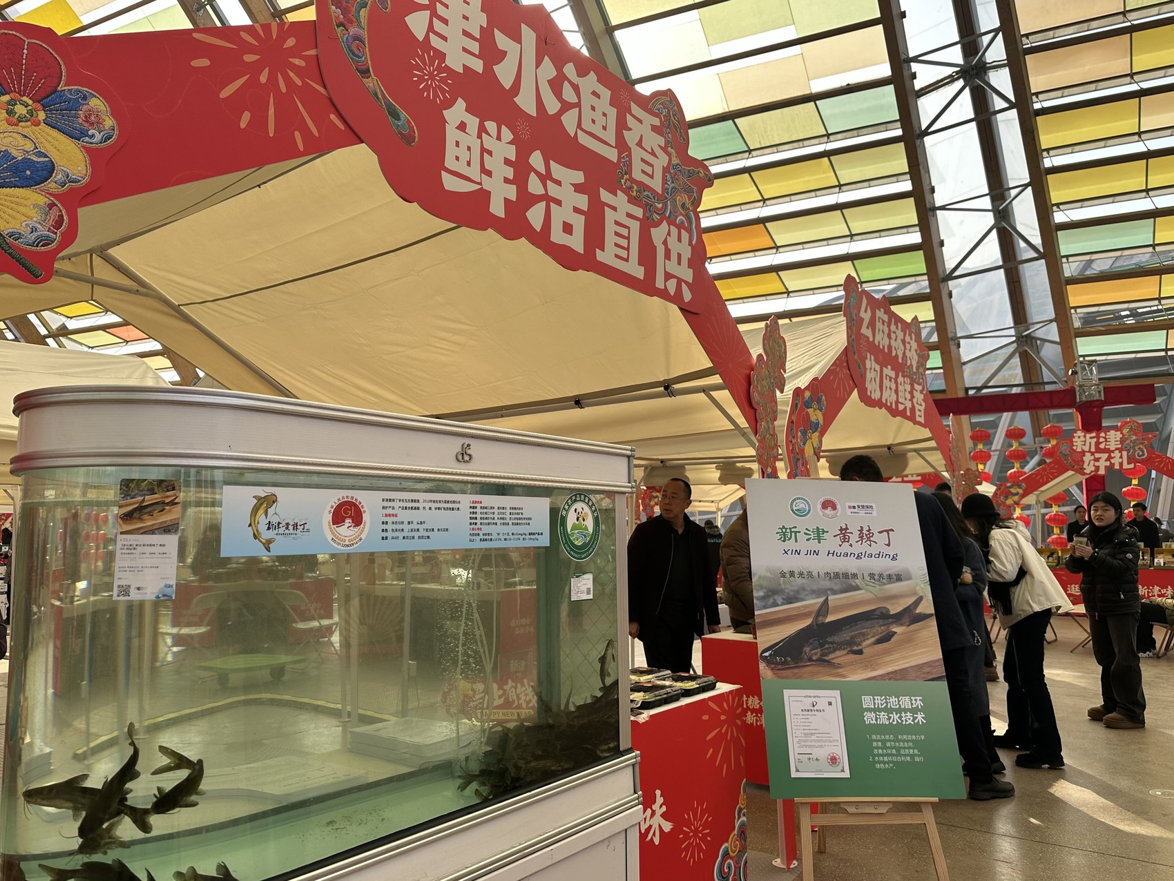 “扫这个码,最快半小时送到家门口。”他指向展台边的二维码,“永辉、盒马、朴朴,线上线下都能买。”2010年,“新津黄辣丁”获批国家地理标志保护产品,所有上市销售的地标鱼,都带着地标专用标识。