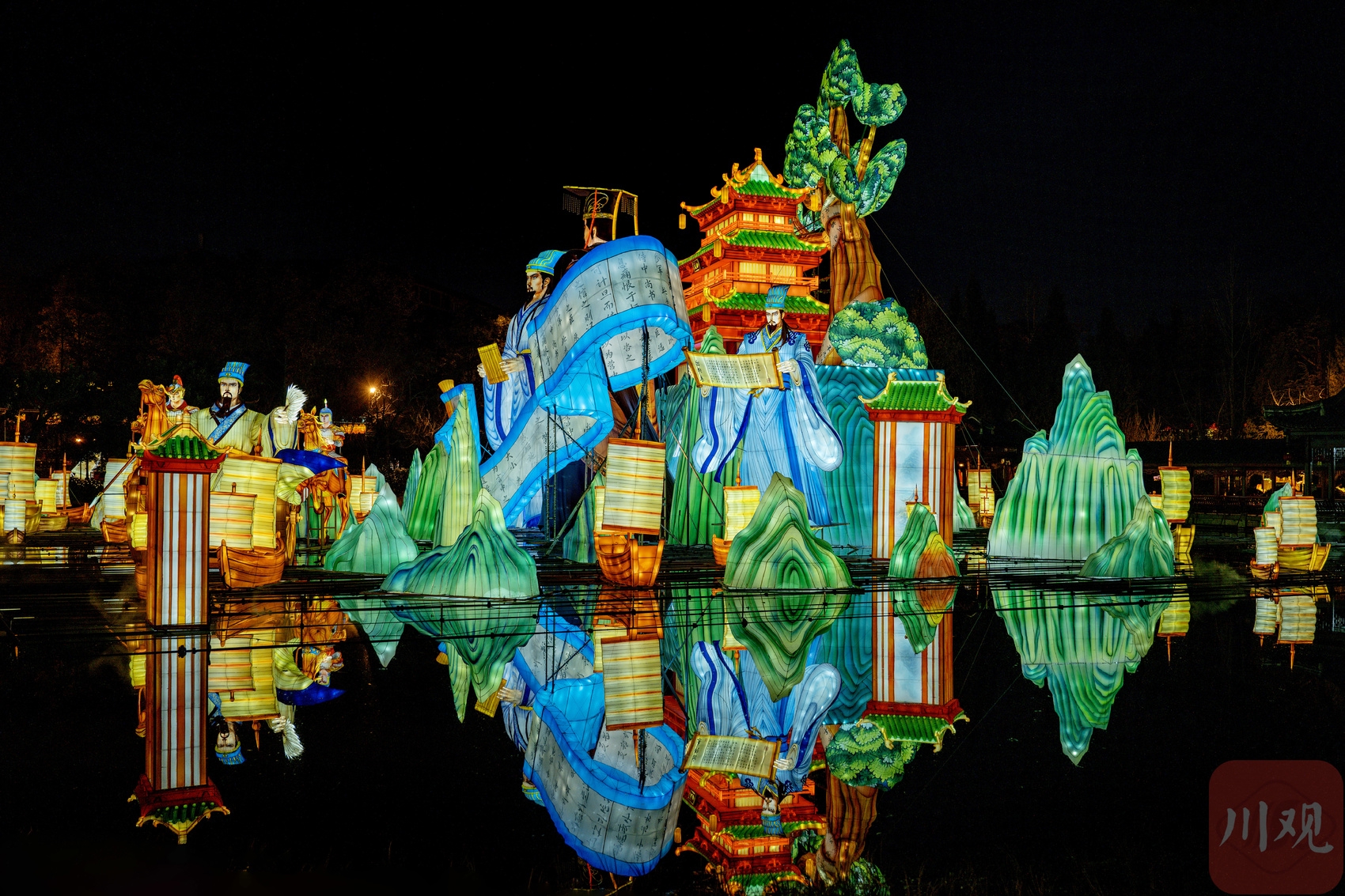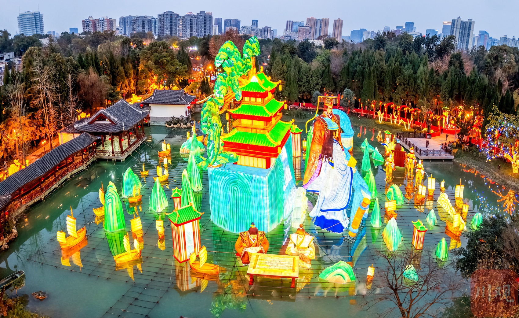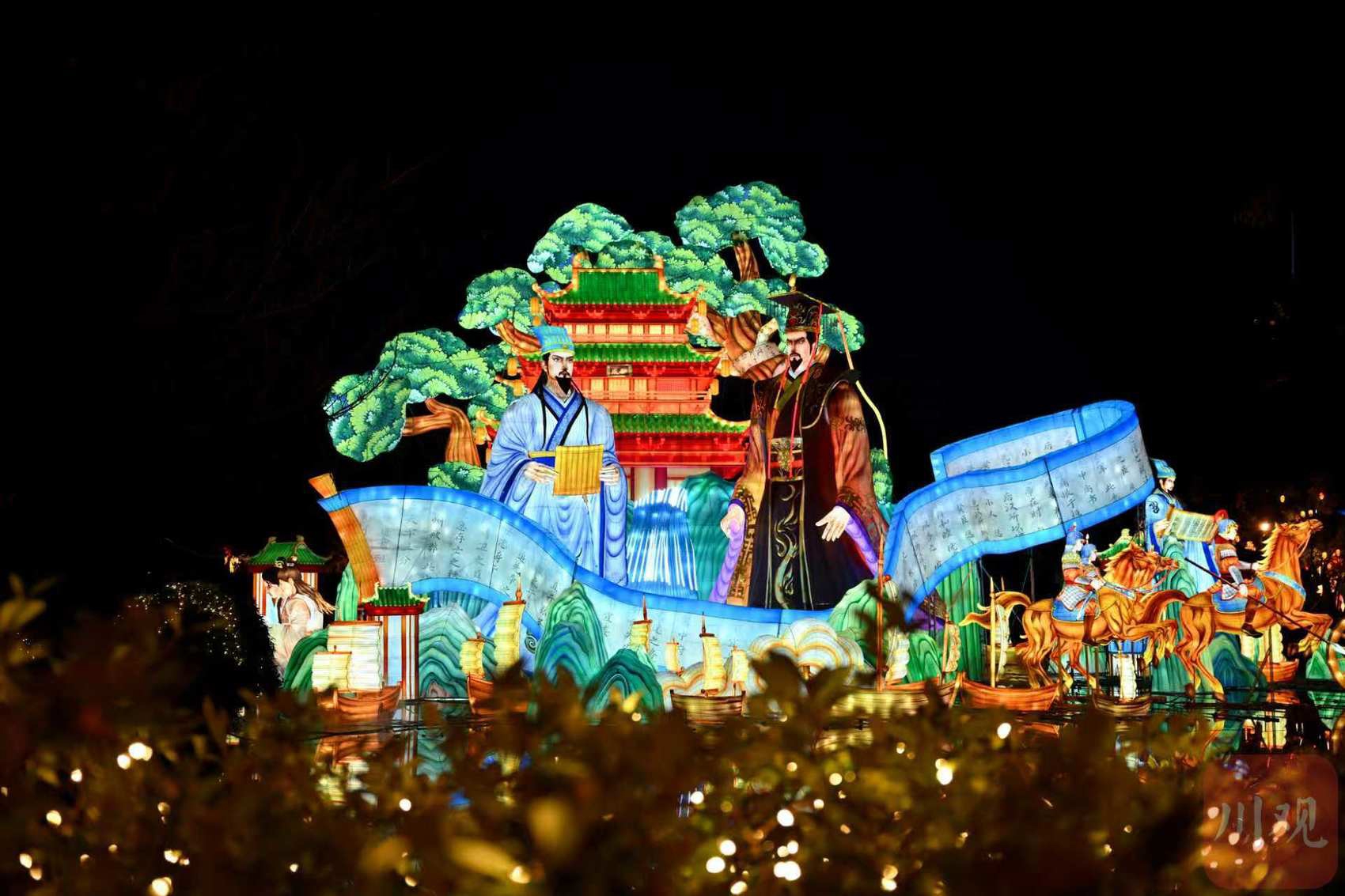 本届庙会以“策马三国·遇见成都”为主题,首次将三国文化与马年生肖深度绑定,灯组规模创下历年之最。记者在现场看到,16组大型灯组与上万盏氛围灯同步点亮,湖面、亭台、古径被光影勾勒出清晰轮廓,新春氛围提前拉满。最吸睛的当属湖面主灯“君臣之交”——长宽各45米、高22米的巨型体量刷新庙会历史,刘备与诸葛亮“鱼水相得”的君臣情谊化为具象光影地标。