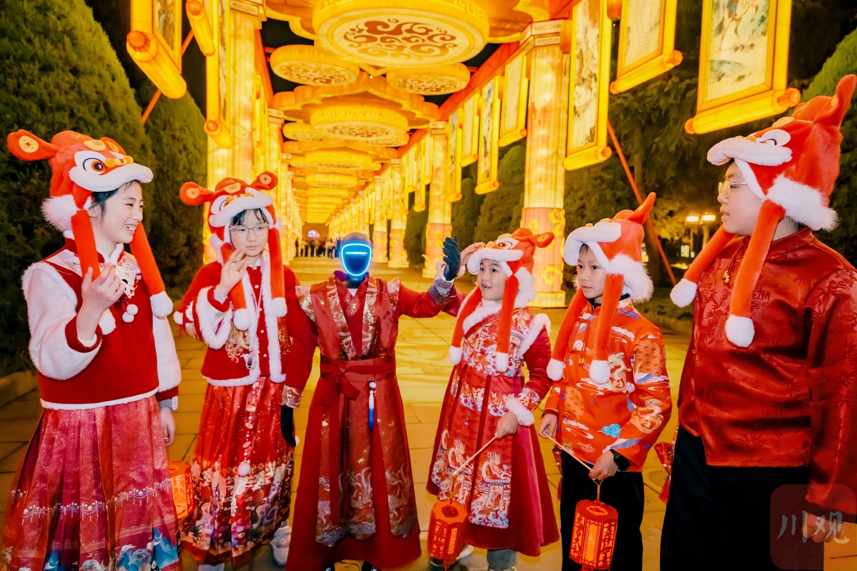 2月11日晚,2026武侯祠成都大庙会试灯活动现场,身着汉服的机器人吸引小喜神围观。C视觉签约摄影师 周巧旻