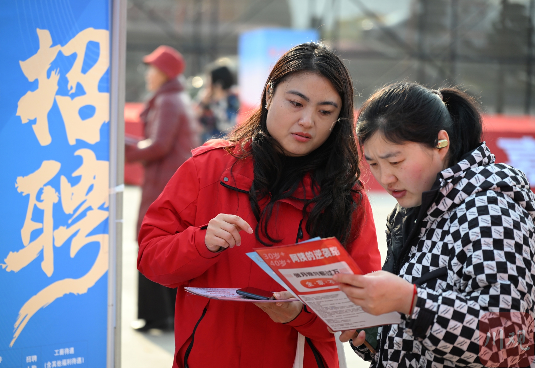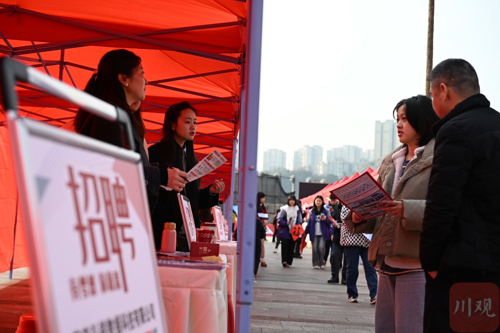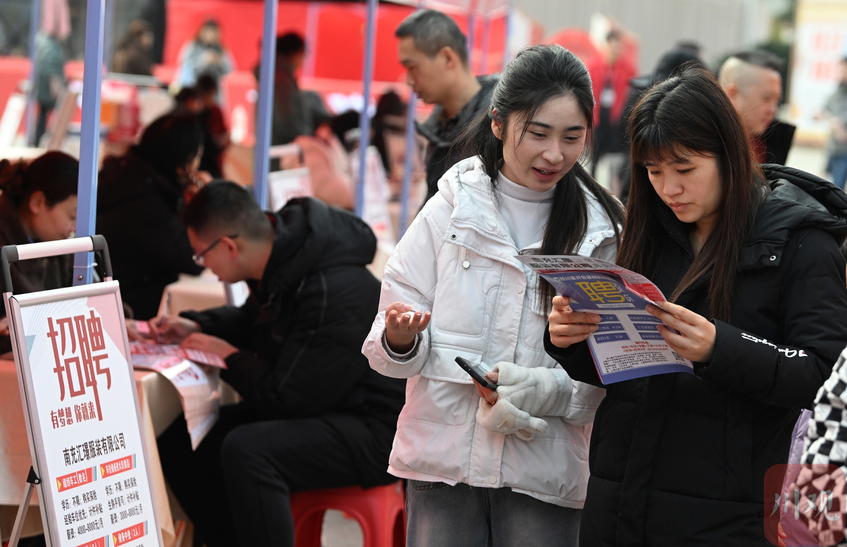 2026年2月12日,在南充市嘉陵区黄金江岸广场,求职者在了解就业信息。